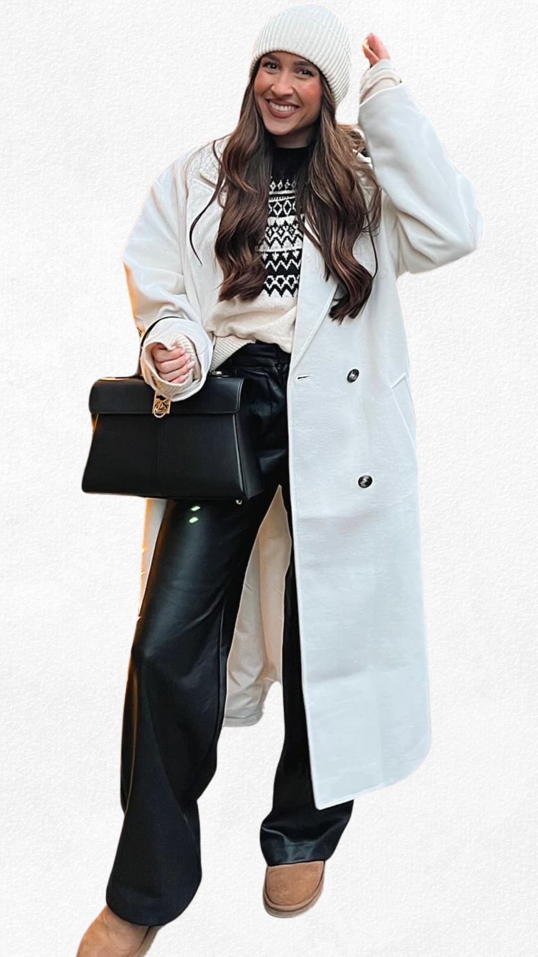 The cozy oversized white coat adds warmth, while the cream sweater’s black and white festive pattern brings holiday cheer.