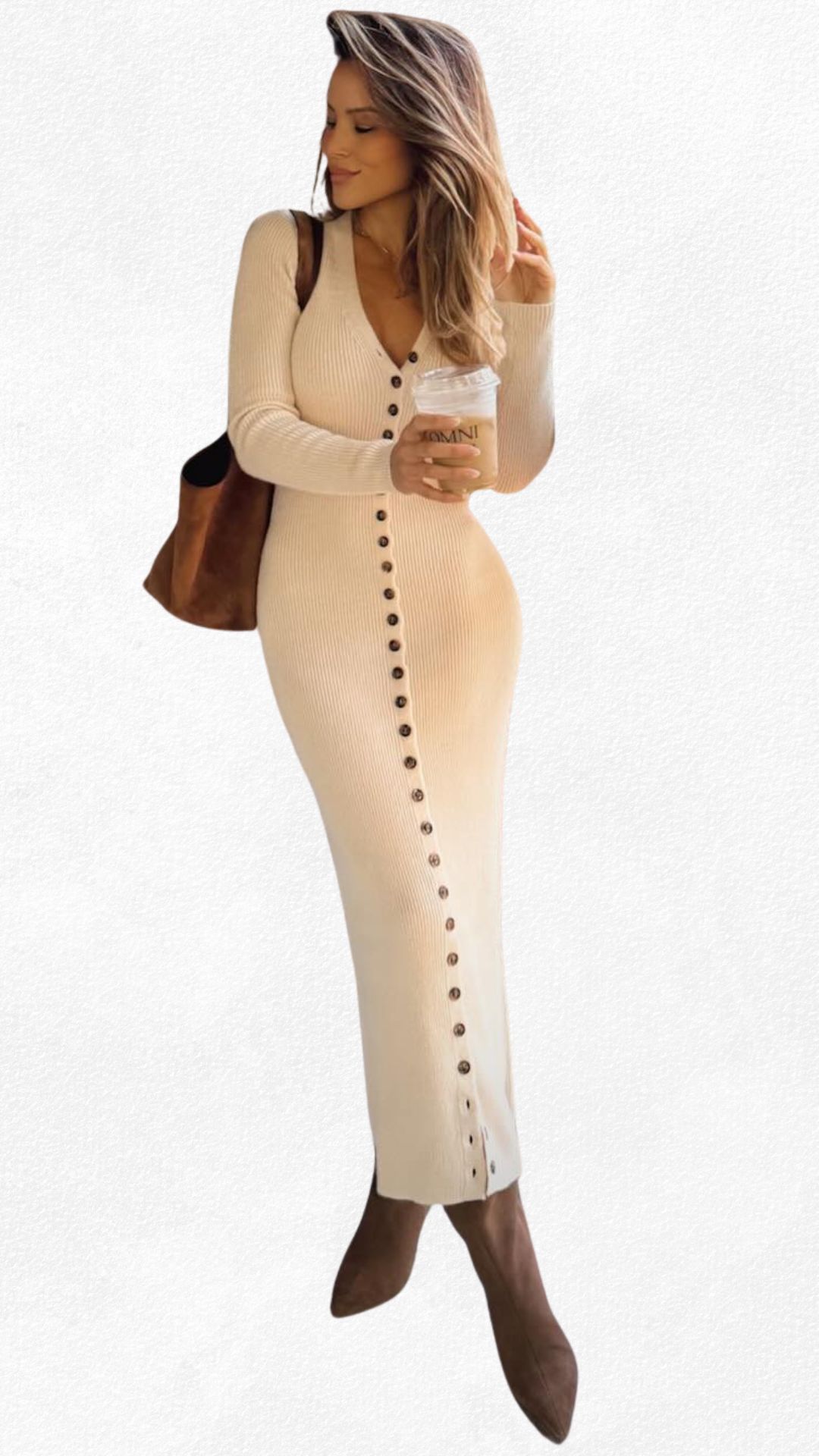 This charming ensemble features a long, cream-colored ribbed knit dress that drapes effortlessly, exuding warmth and style for holiday gatherings.