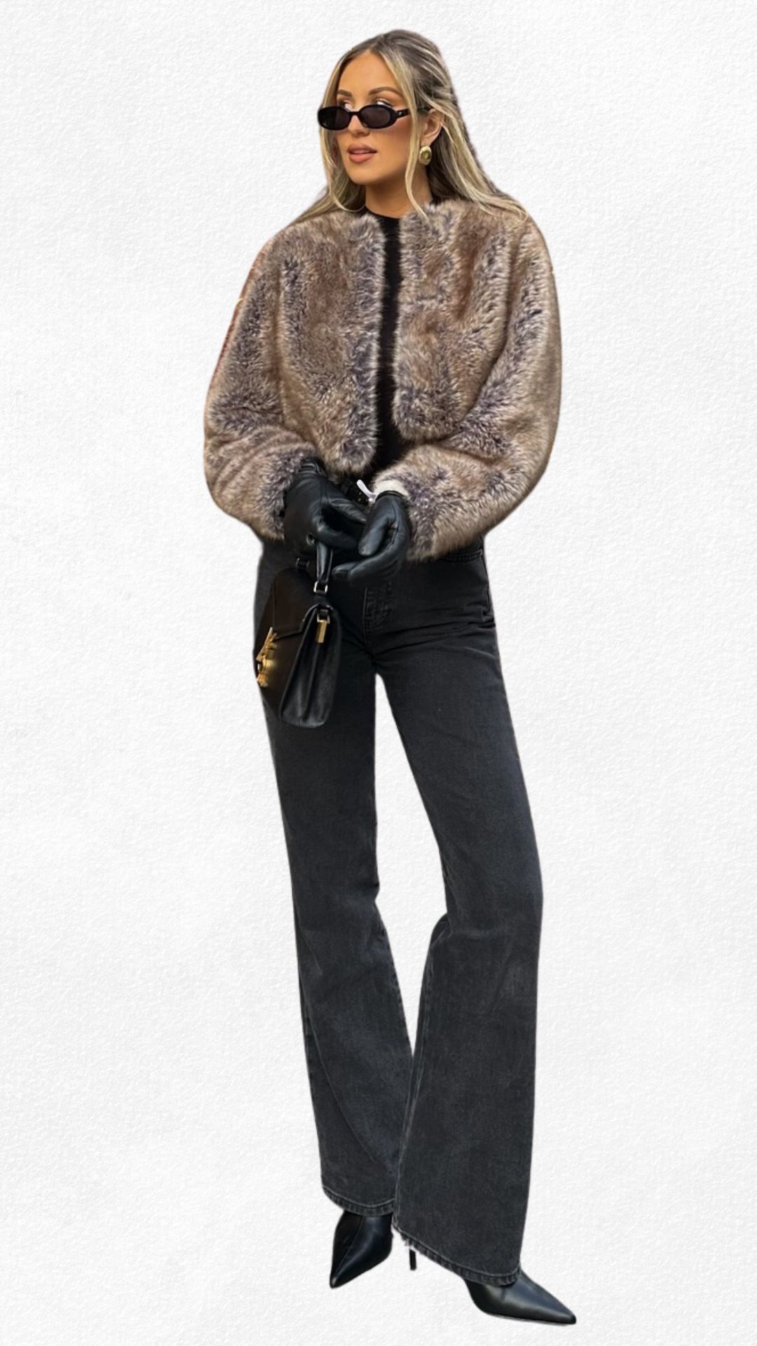 This cute Christmas outfit features a chic, warm taupe faux fur cropped jacket that adds a touch of elegance.