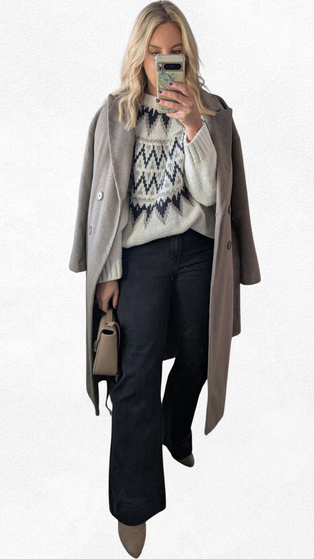 This cozy white sweater features a striking black and charcoal geometric pattern, adding a modern twist to a classic holiday look. Layered under an oversized gray coat, it perfectly balances comfort and style.