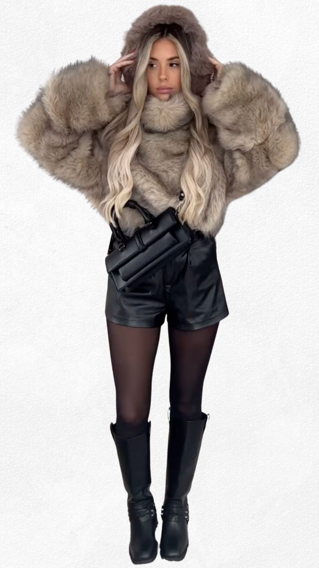 The fluffy taupe oversized hoodie adds a cozy element, while the sleek black leather shorts offer a chic contrast.