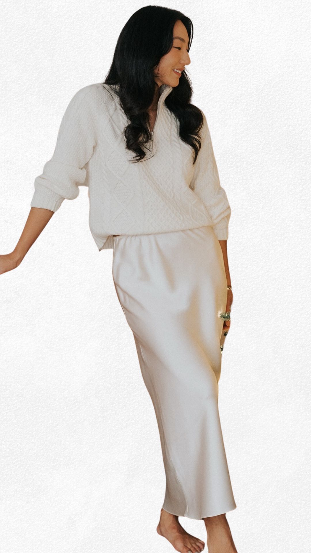 The cream-colored cable-knit sweater features a half-zip collar, adding a touch of casual chic, while the silky pale satin midi skirt drapes beautifully, creating an effortlessly graceful silhouette.