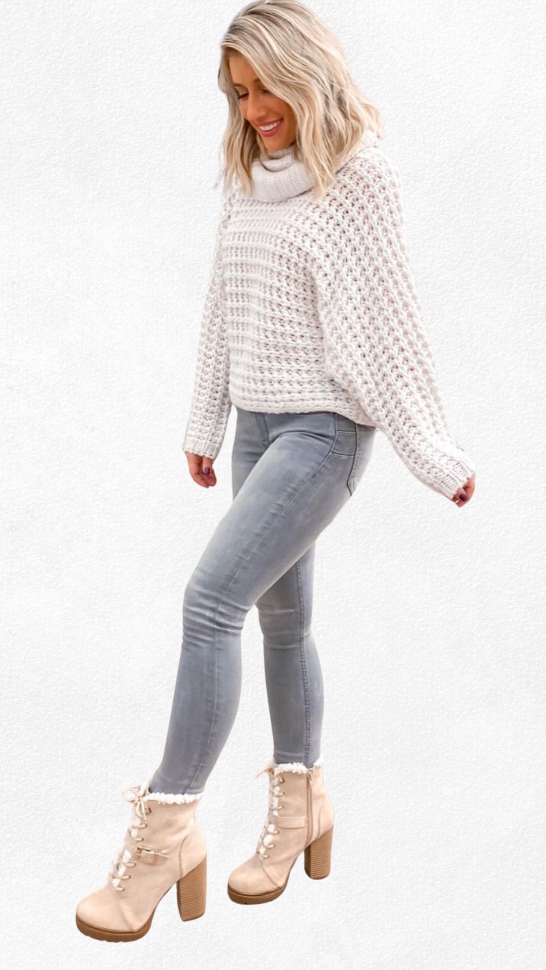 This outfit radiates warmth and festive charm, featuring a cozy white chunky knit sweater that drapes perfectly around the cowl neckline.