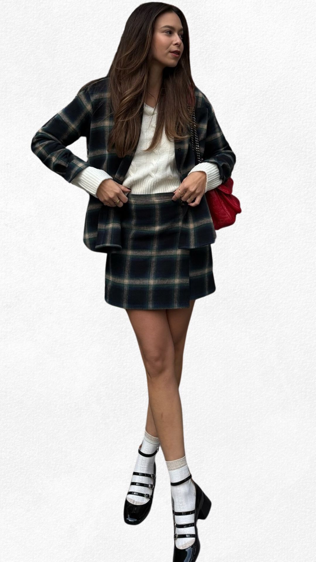 The matching plaid skirt adds a chic touch, while the striking red handbag provides a vibrant pop of color.