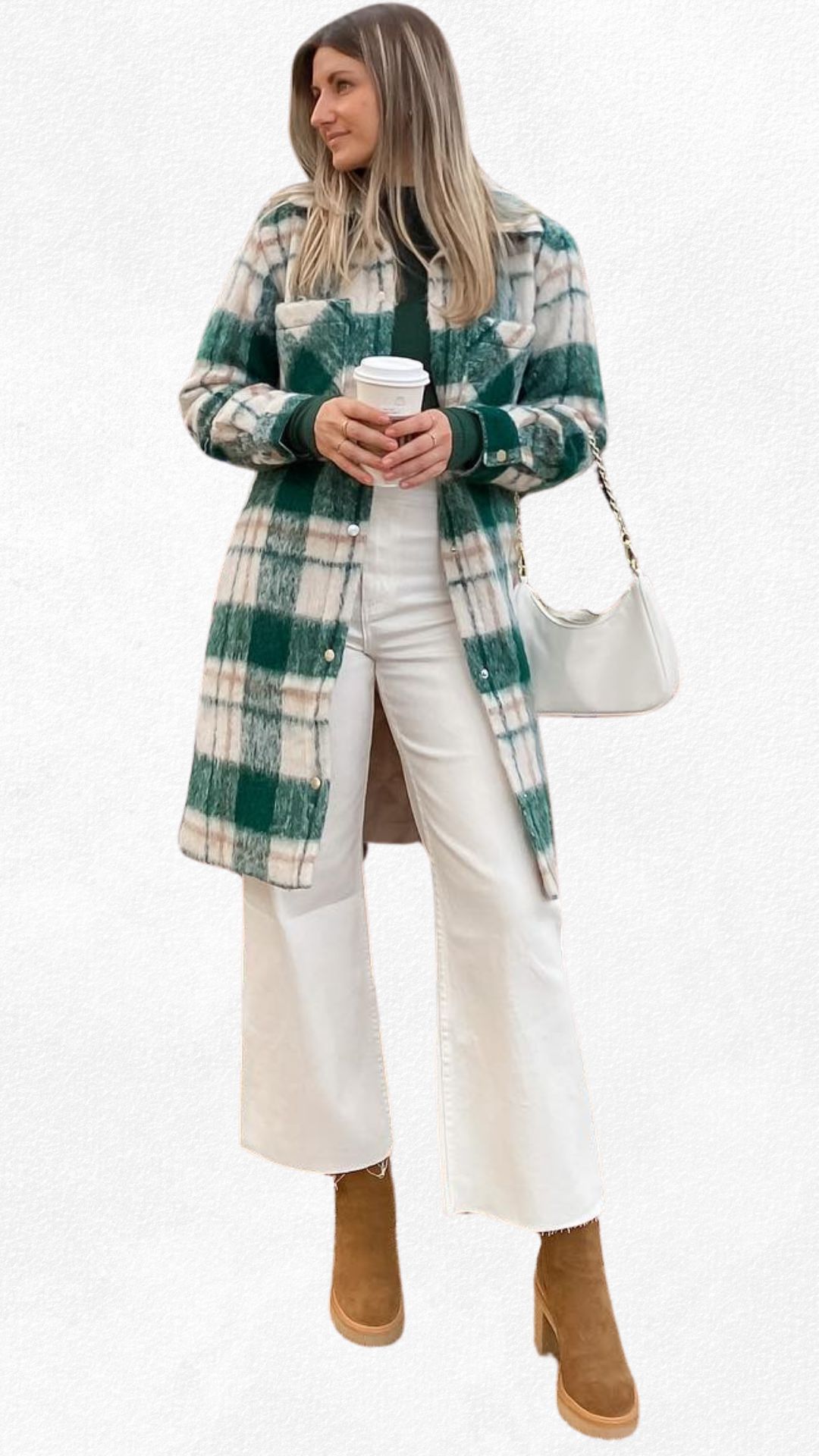 This festive outfit showcases a cozy long, green and cream plaid shacket that exudes holiday spirit.