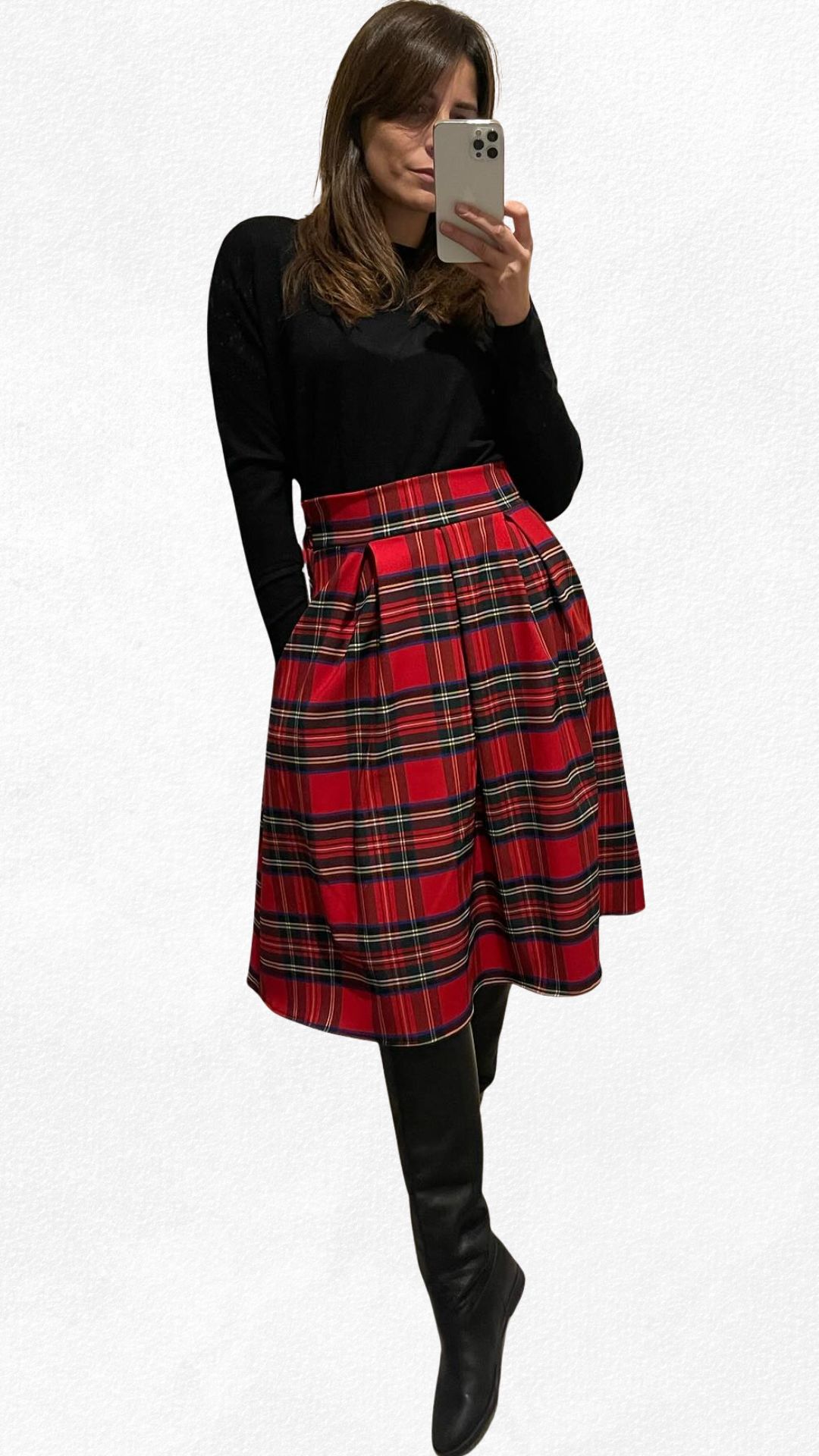 The black long-sleeve sweater offers a cozy contrast to the vibrant red plaid skirt, which features cheerful shades of red, green, and yellow in a fun flared silhouette.