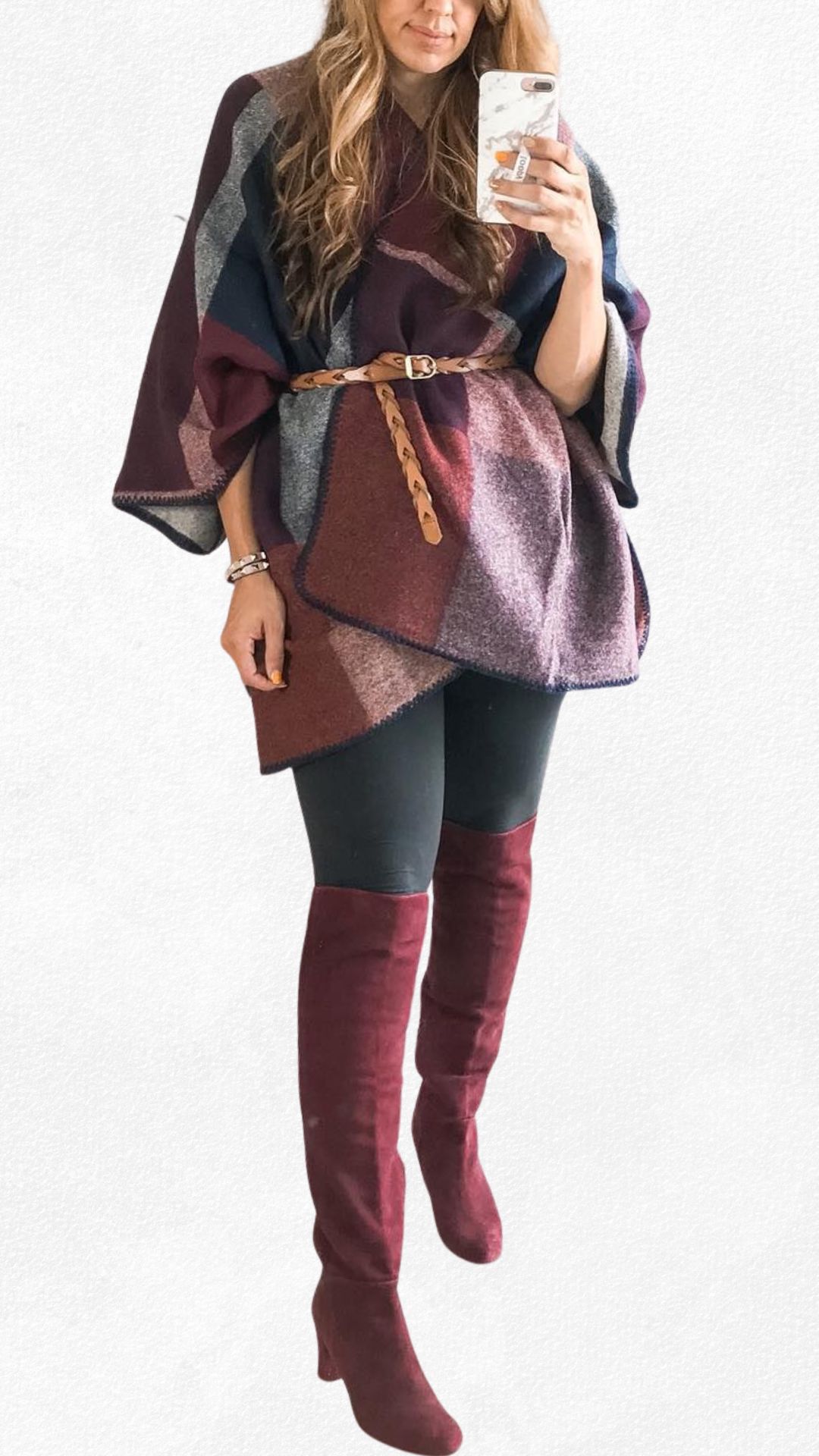 This charming Christmas outfit is centered around a stylish burgundy, navy, and gray plaid poncho that exudes warmth and festivity.