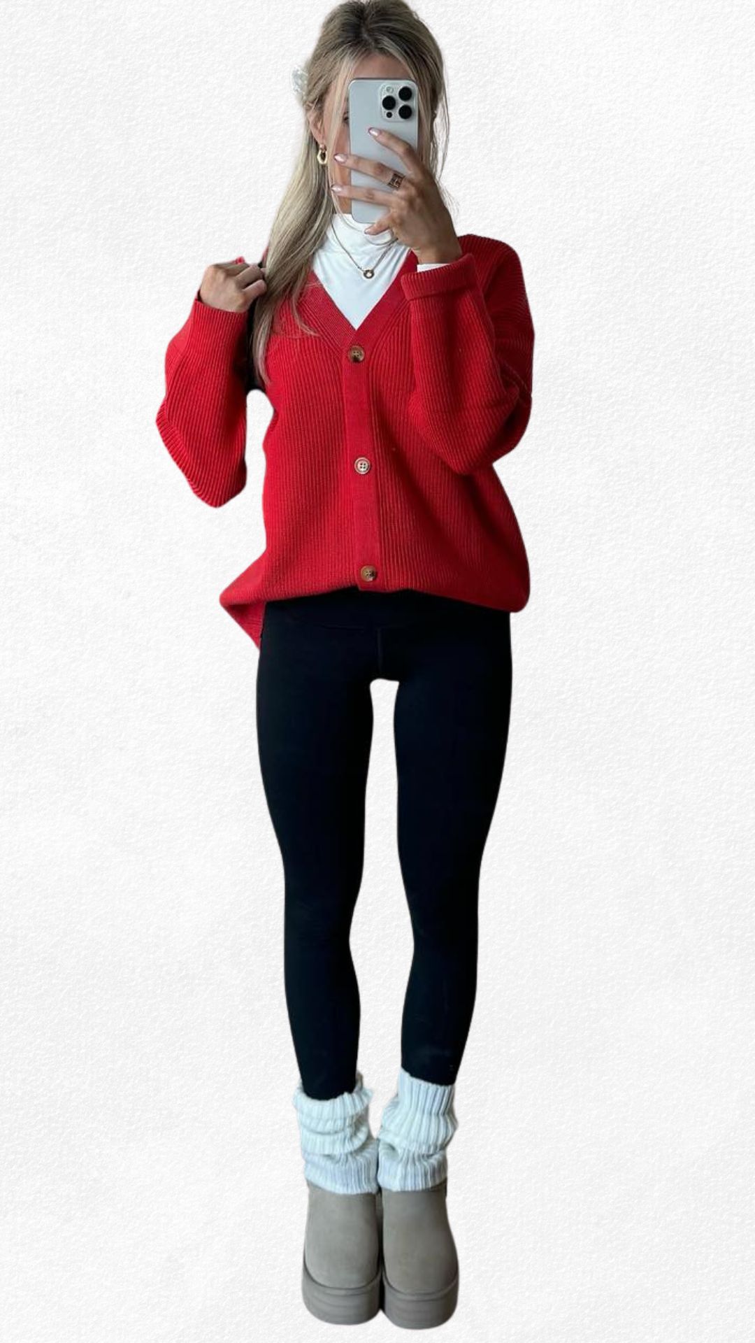 This festive outfit showcases a warm, bright red ribbed cardigan that exudes holiday cheer.