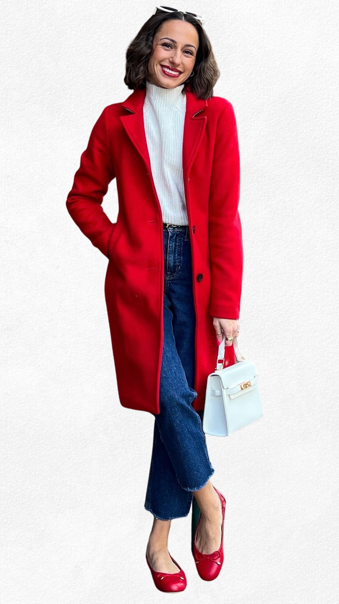 Cute Christmas Outfit With a Vibrant Red Wool Coat