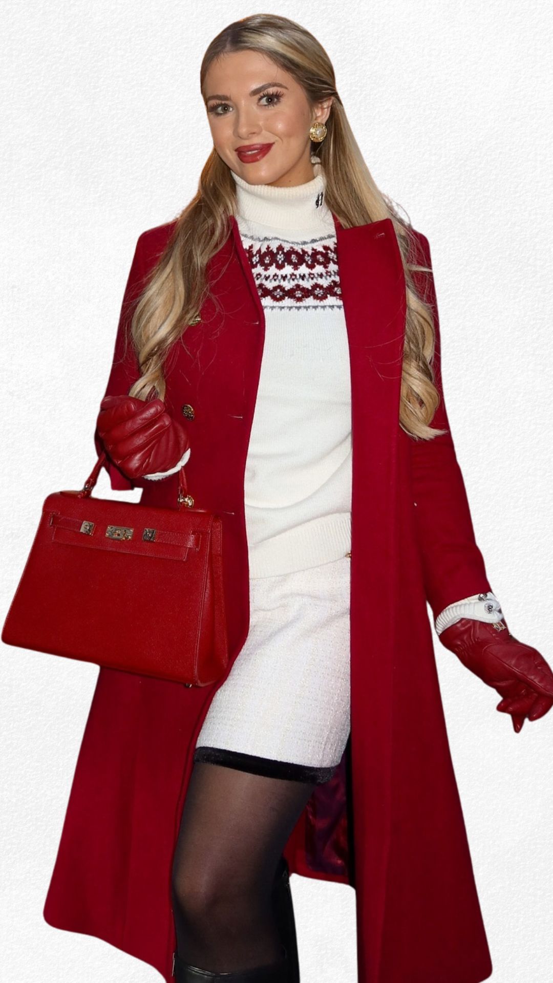 Accessorized with bright red leather gloves and a matching handbag, this polished look is perfect for any Christmas gathering or festive outing.