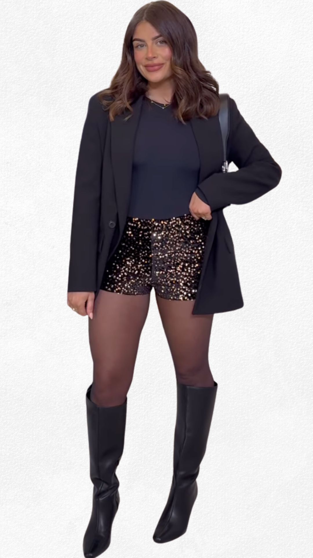 Eye-catching sequin shorts in shimmering black and rose gold add a playful twist, while sheer tights complete the chic look.