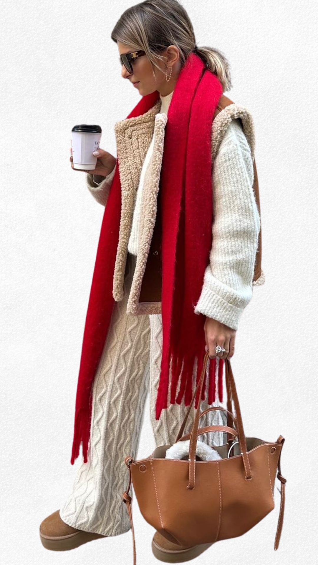 Layered with a soft beige sherpa vest for texture, a vibrant red scarf adds a festive pop of color, making it ideal for holiday gatherings.