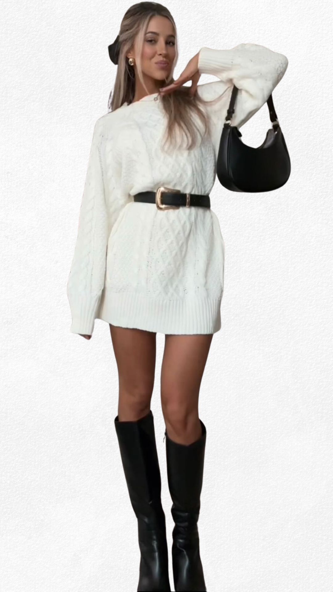 This outfit features a snug oversized cable-knit sweater dress that embodies comfort and elegance.