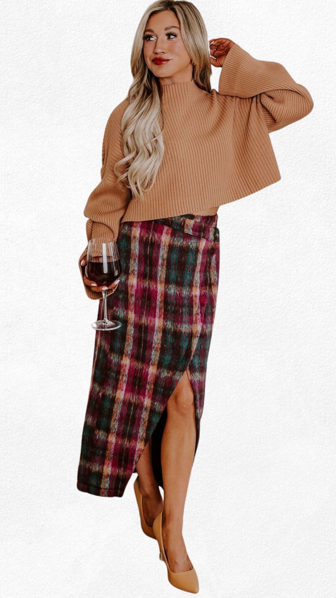 This outfit exudes warmth and style, featuring a cozy beige ribbed crop sweater that beautifully complements a long plaid skirt.