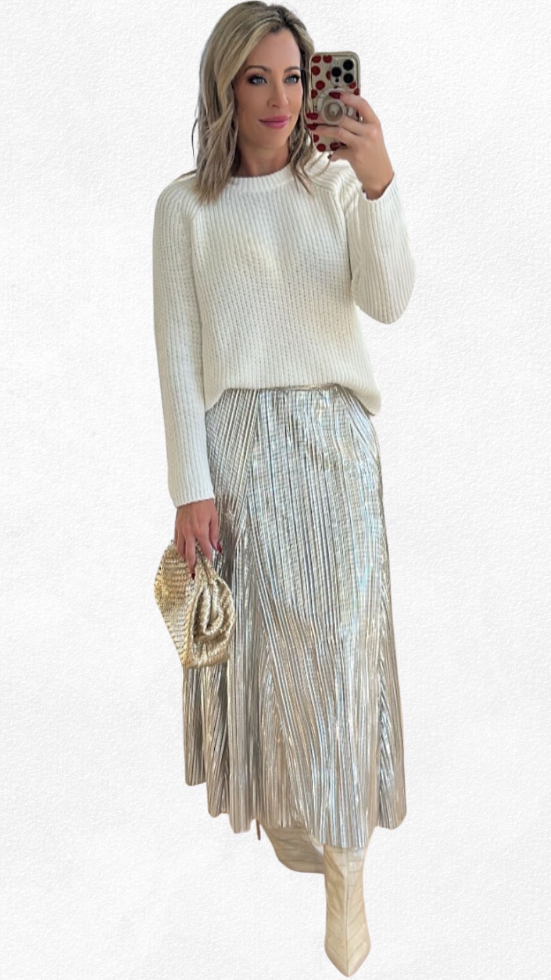 The shiny, silver pleated midi skirt adds a touch of festive flair, enhancing the overall aesthetic with its textured design.