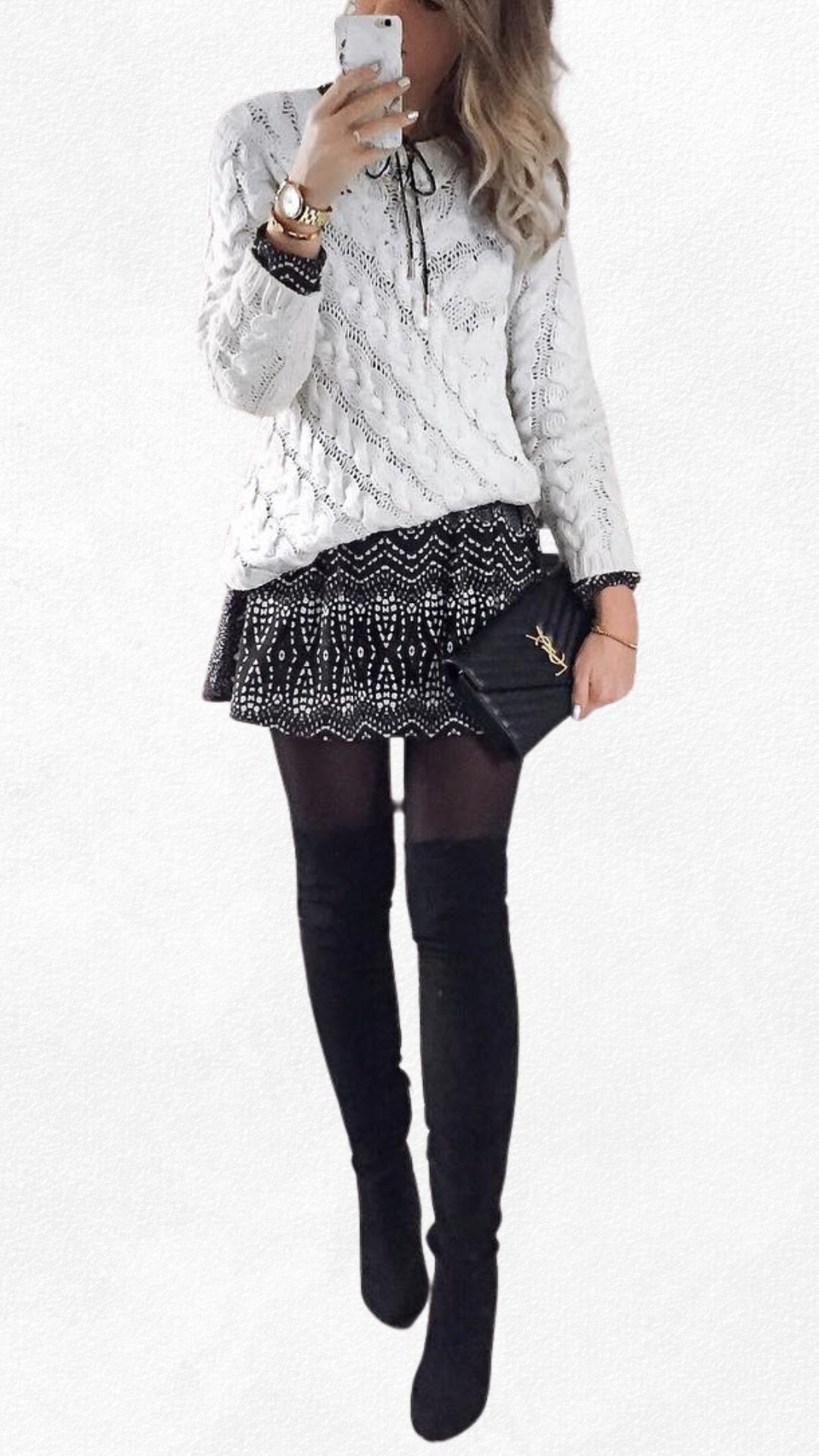 A playful black mini skirt balances the look, while the stylish black knee-high boots elevate the overall outfit. Textured black tights, embellished with a delicate bow pattern, provide a charming detail perfect for holiday gatherings and celebrations.