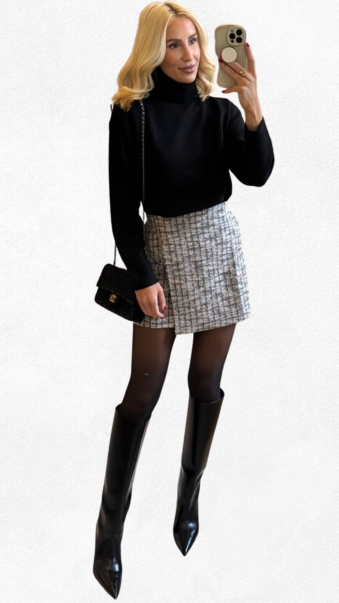 The classic tweed mini skirt adds a sophisticated touch with its textured black and white pattern, while sheer black tights enhance the overall elegance.
