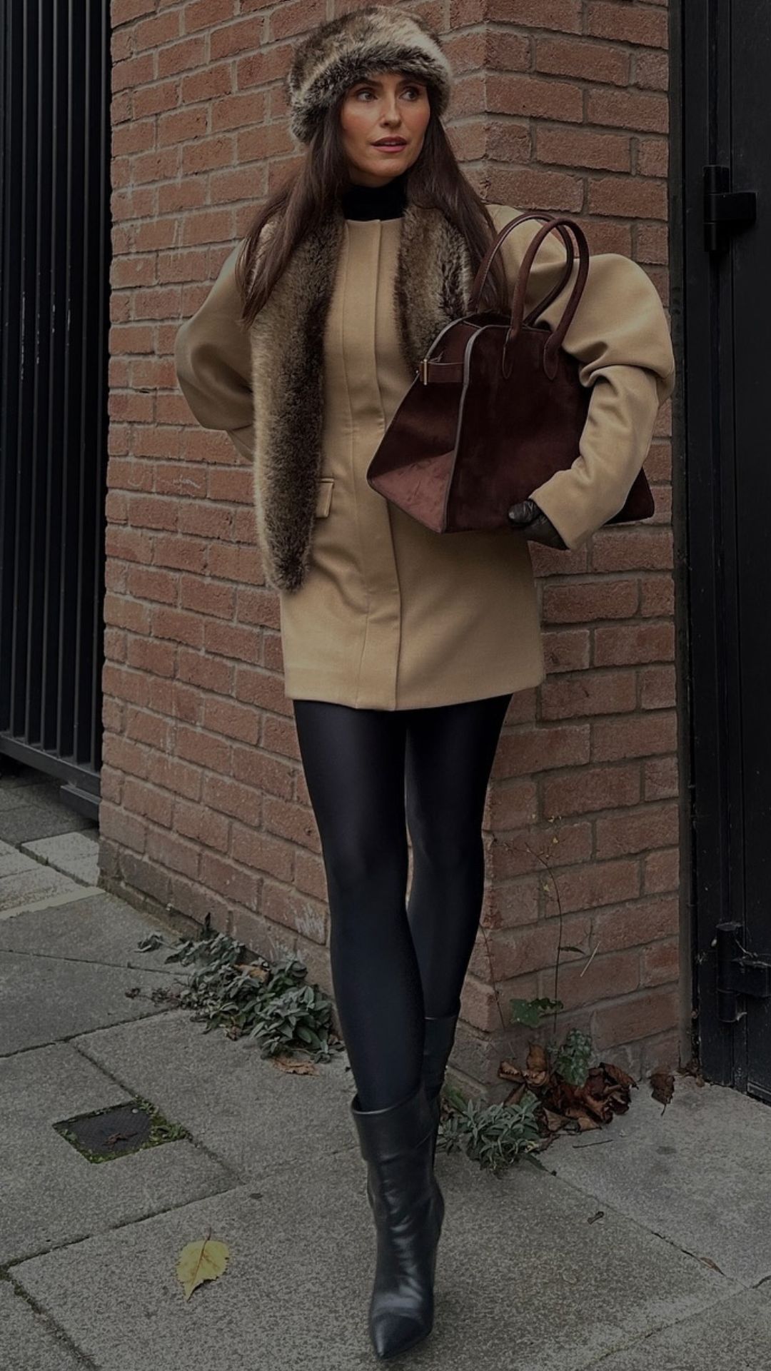 Completing the outfit are chic pointed black heels, adding an element of sophistication, along with fur earmuffs and brown leather gloves for practicality.