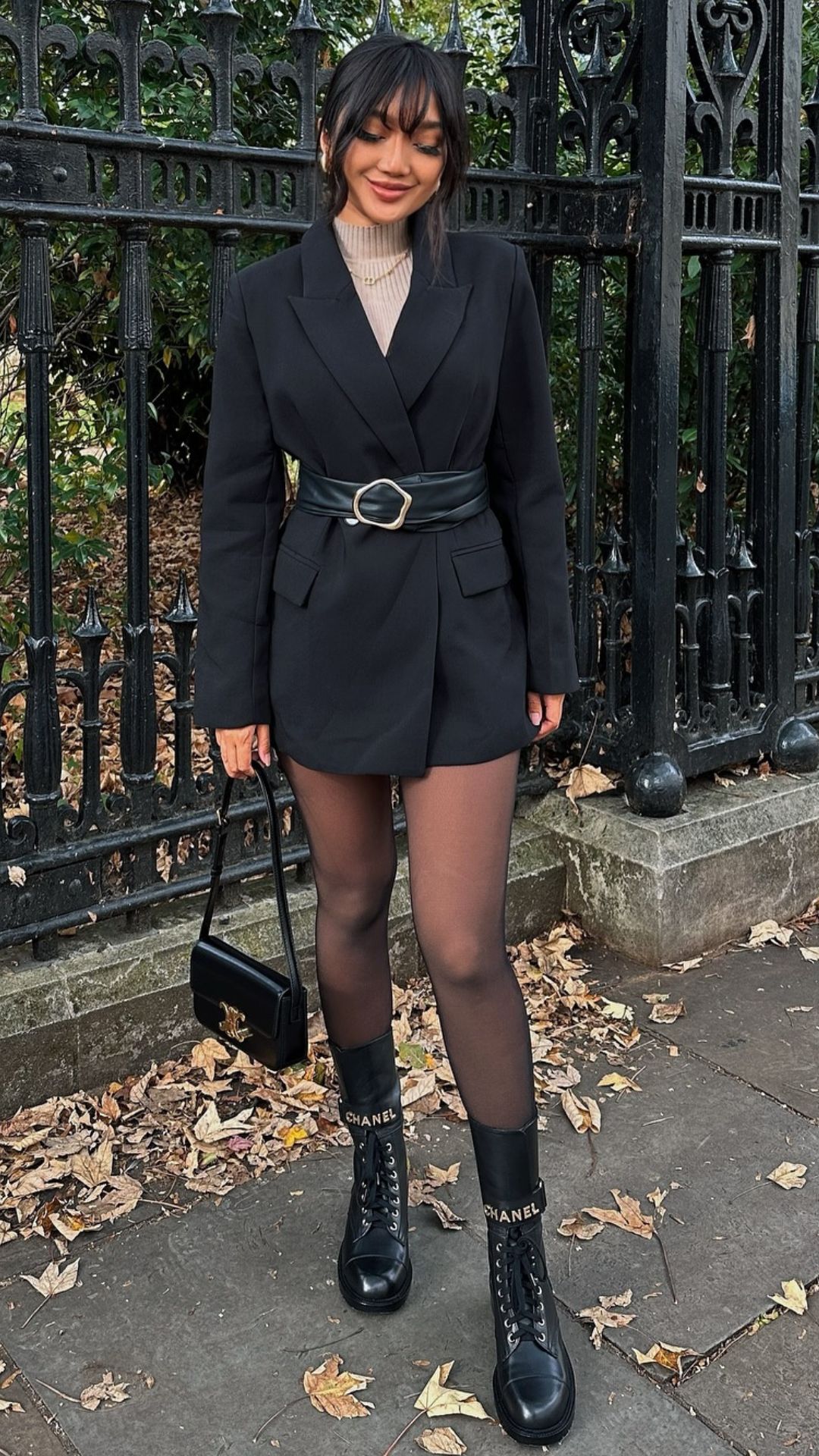 Pairing the blazer with sheer black tights adds a modern edge, while knee-high, sleek black leather boots enhance the outfit’s elegance.