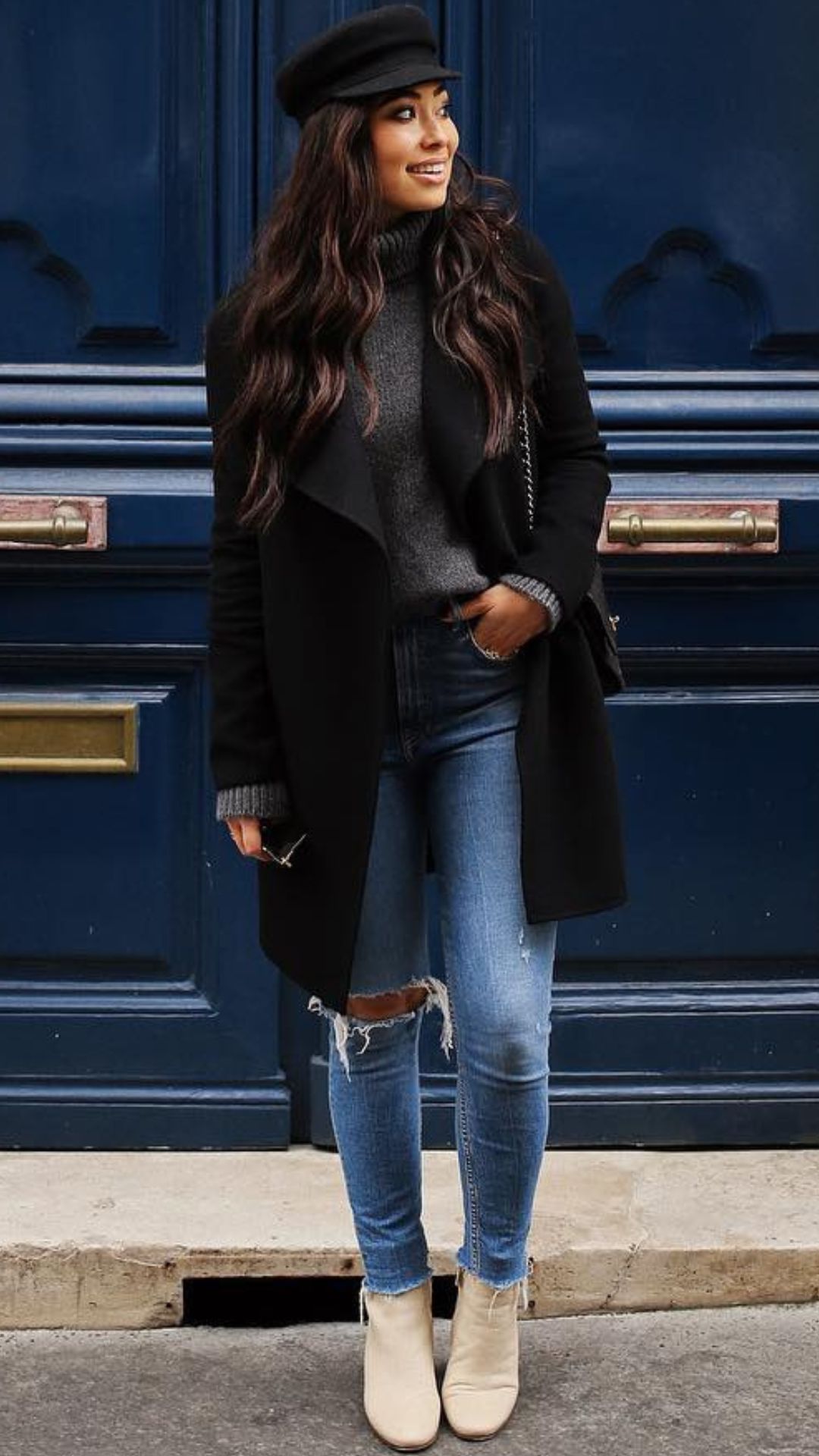 Layered beneath is a fitted, chunky gray knit turtleneck sweater, providing warmth without compromising style. Distressed medium-wash skinny jeans lend a contemporary edge, making the outfit casual yet refined.