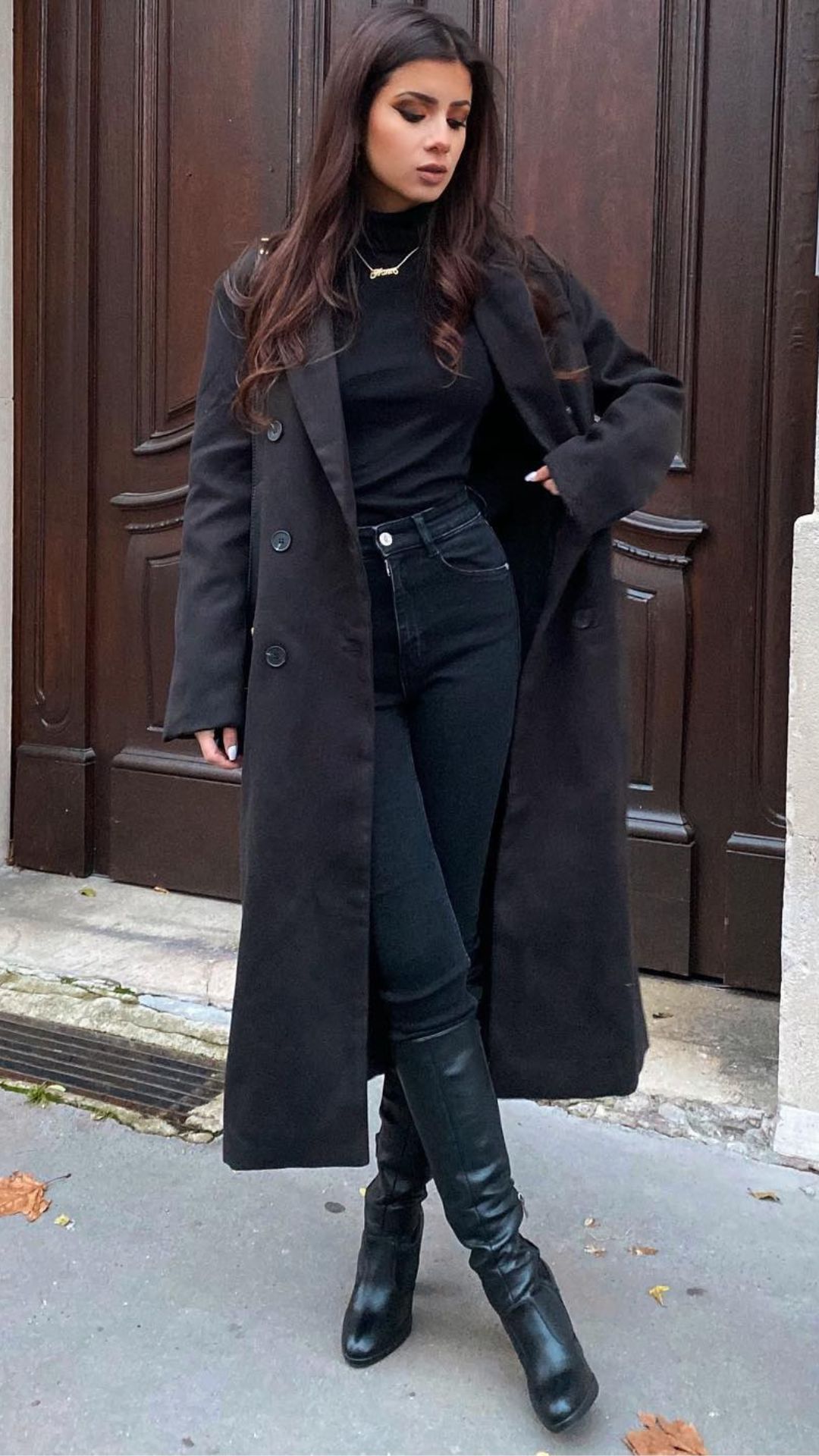 This European-inspired winter outfit perfectly showcases a blend of sophistication and modern flair. The long, structured black coat adds a tailored touch, ideal for chic city strolls.