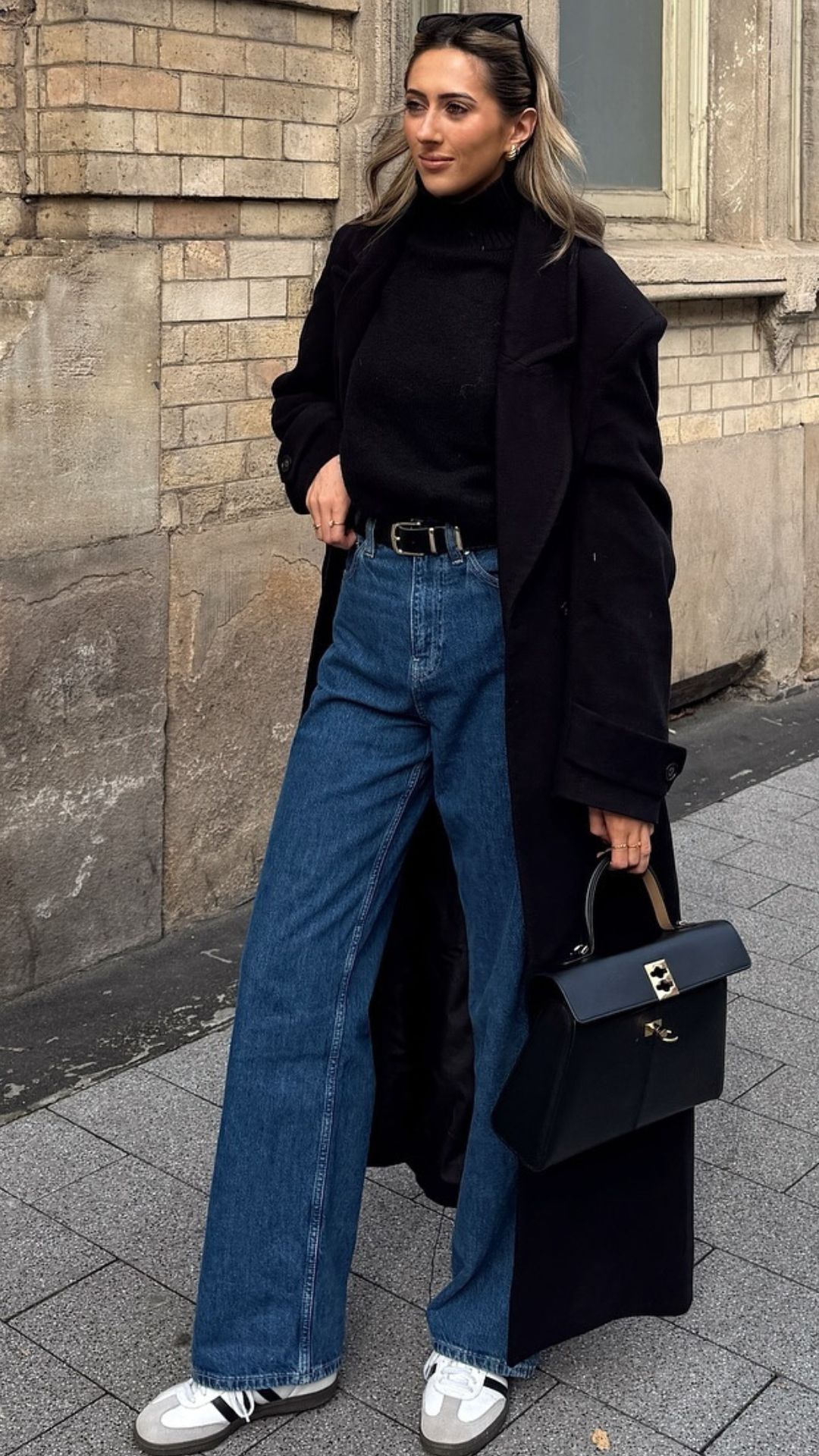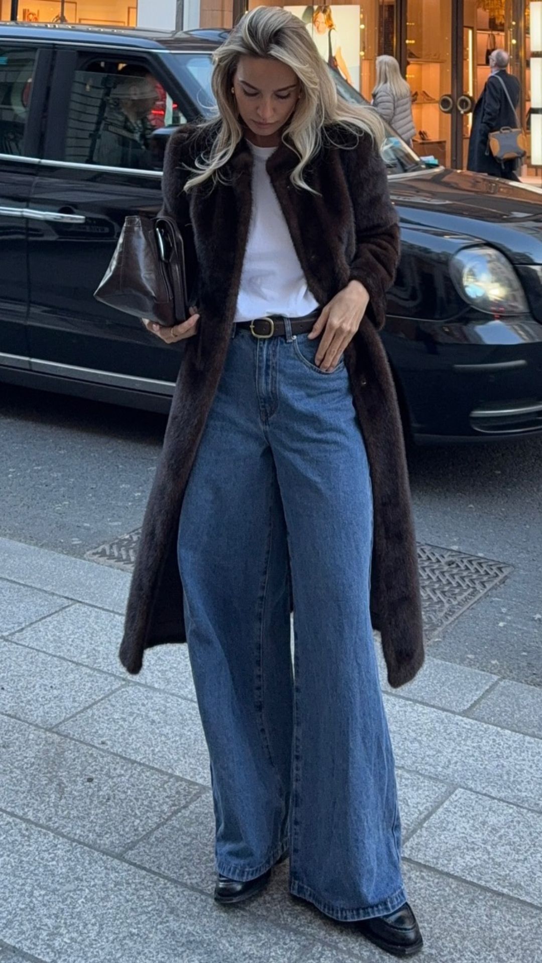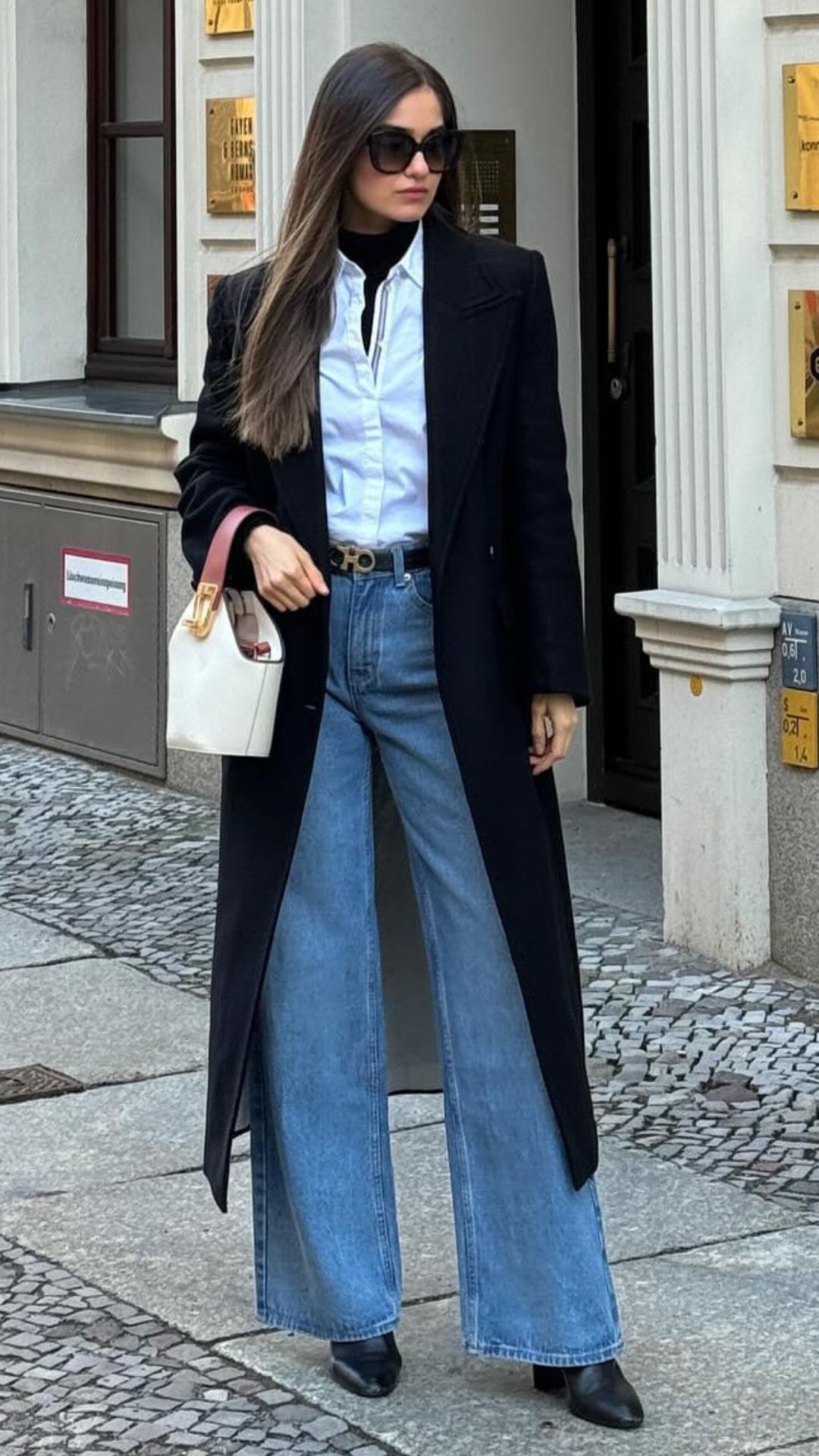 High-waisted, wide-leg blue denim jeans add a modern twist, balancing the tailored outerwear with casual ease.