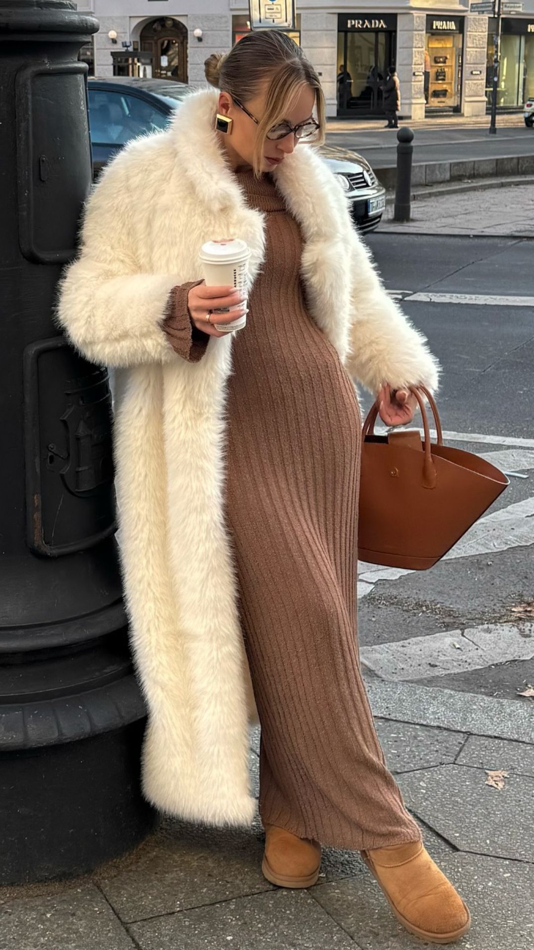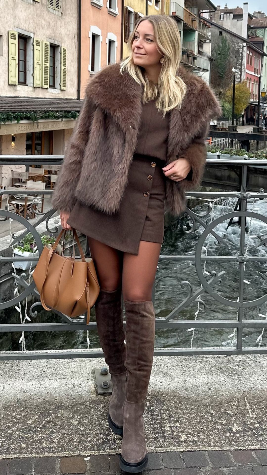 This stunning winter outfit is a perfect representation of elegant European fashion. The striking brown faux fur coat offers a plush texture that adds warmth and style, making it an ideal choice for chilly days.