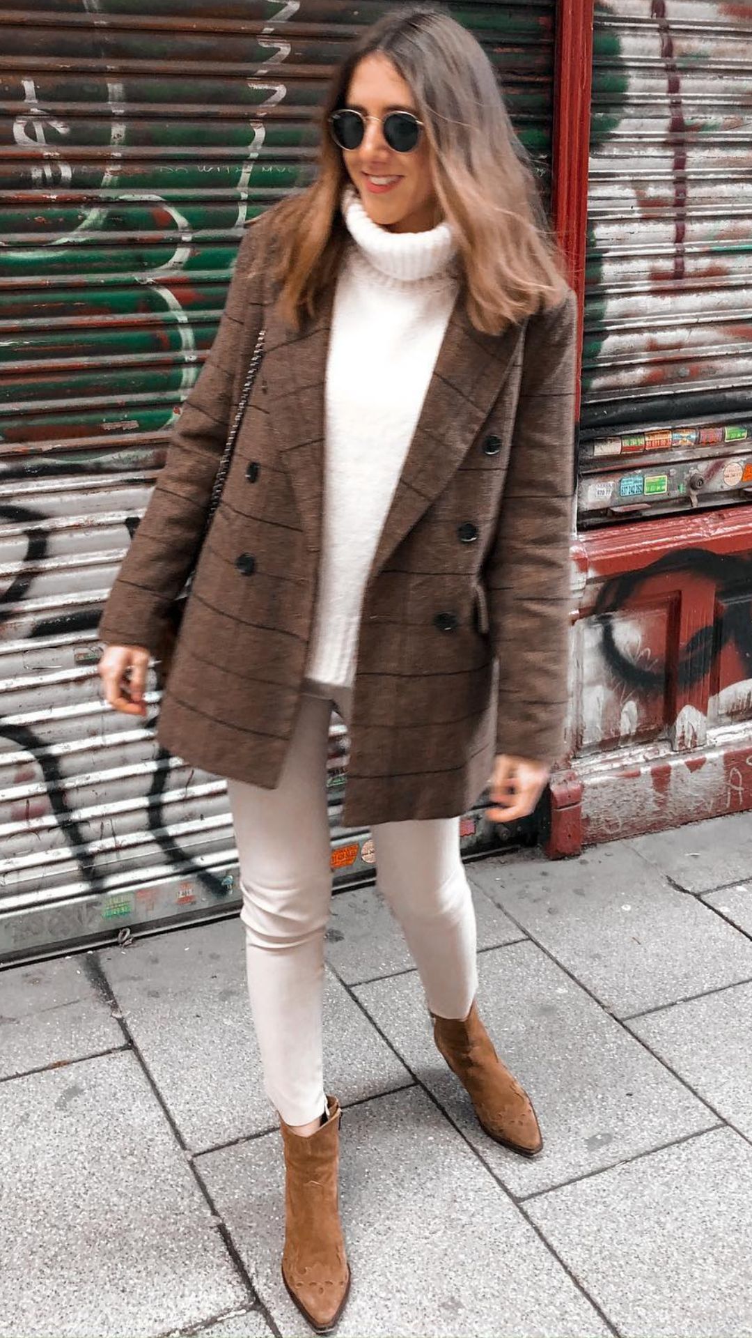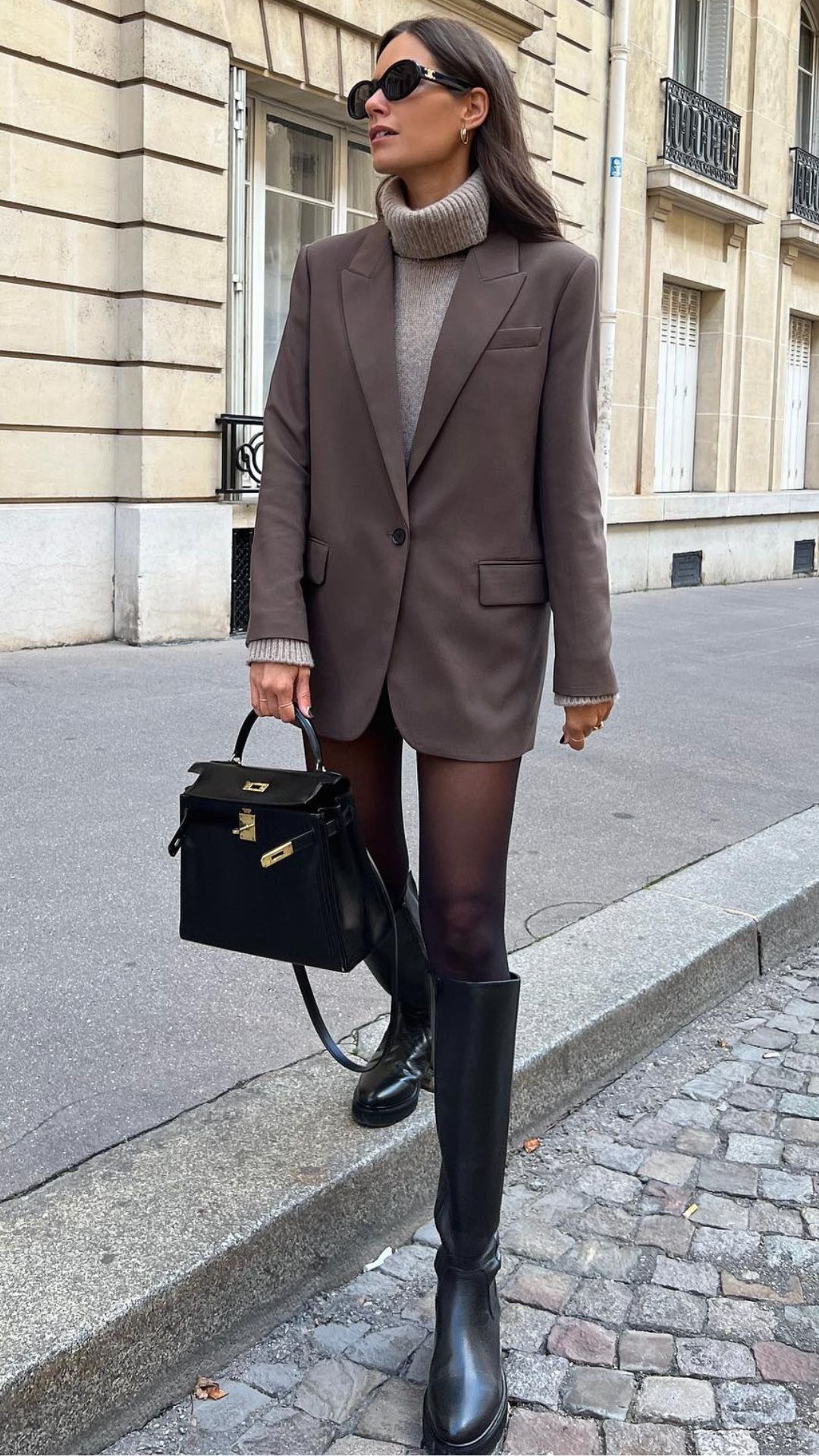 This winter outfit features a tailored, oversized brown blazer crafted from structured fabric, expertly layered over a soft beige turtleneck sweater.