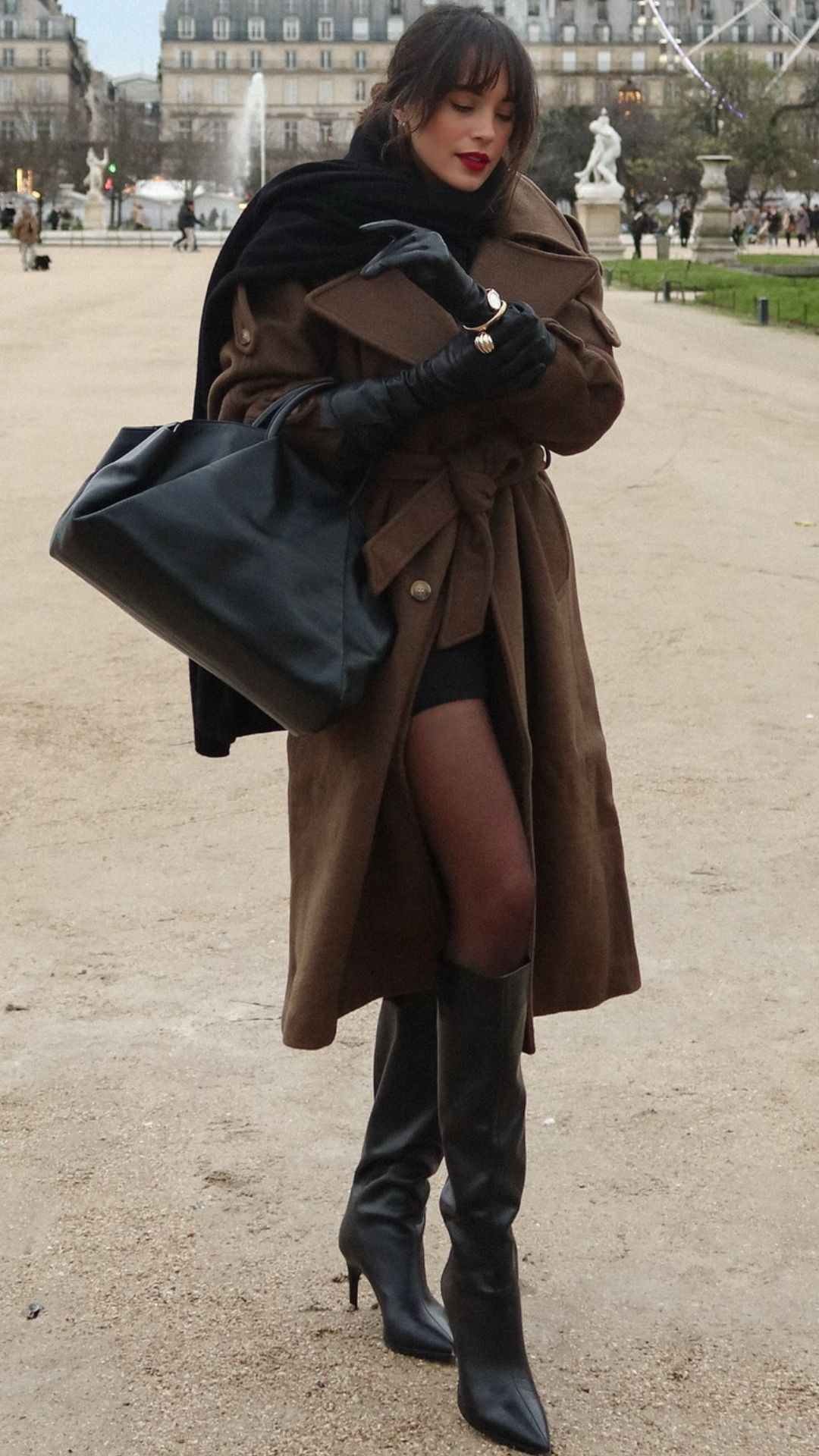 Dark tights enhance the sleek silhouette, while the deep brown scarf adds a sophisticated touch, perfectly harmonizing with the structured brown leather handbag.