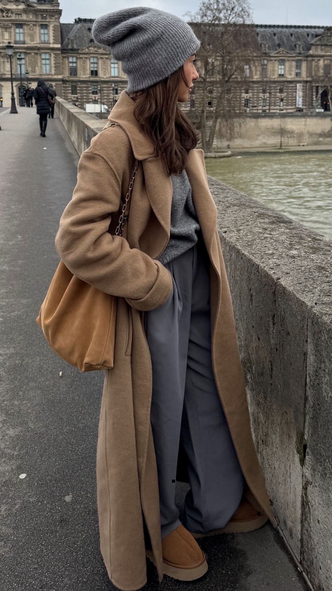 To complete the outfit, a structured tan handbag adds sophistication and practicality, embodying the chic yet cozy aesthetic typical of contemporary European styles.