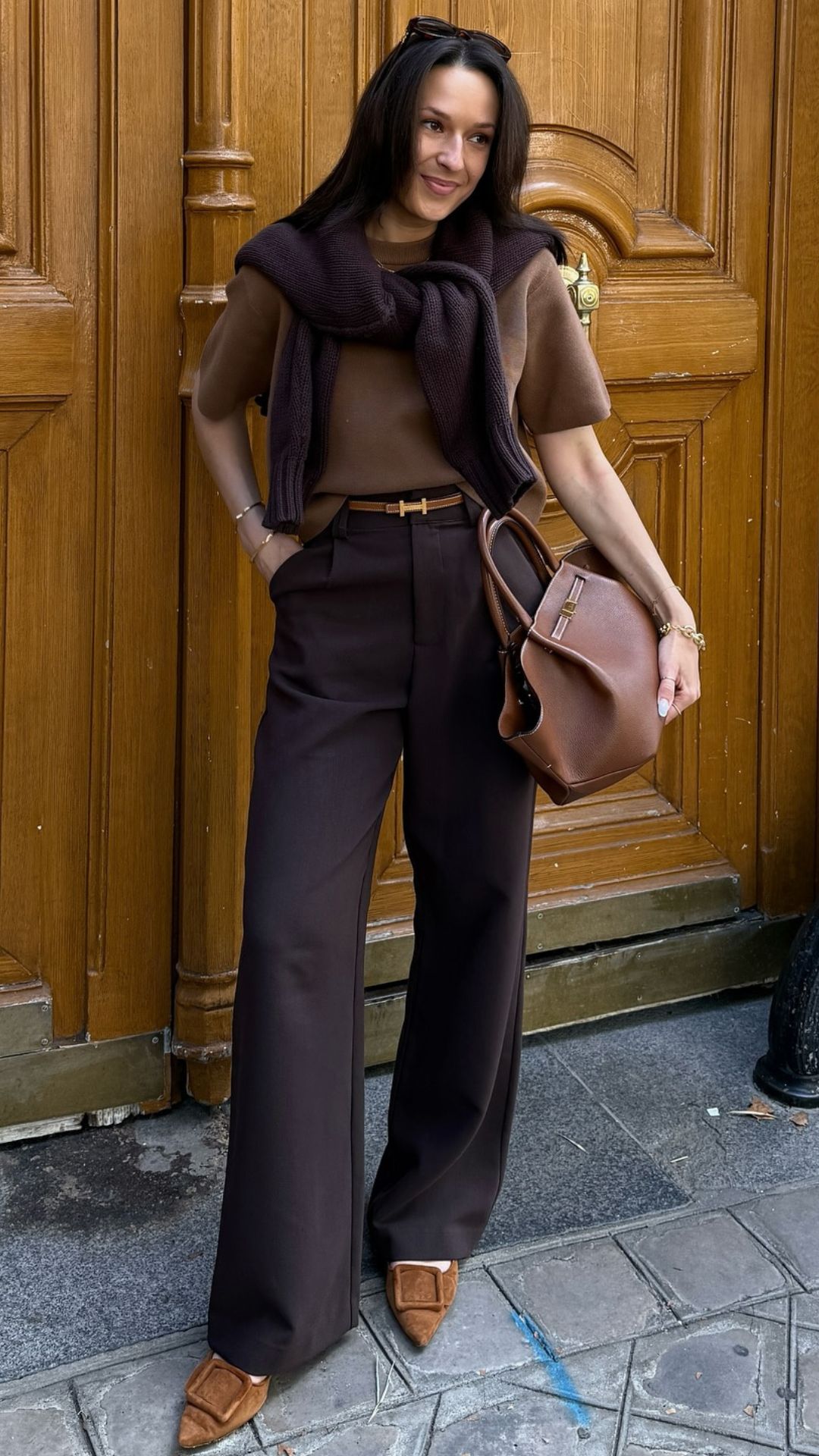 Completing the outfit, the dark brown suede handbag and heeled ankle boots create a harmonious blend of comfort and refinement.