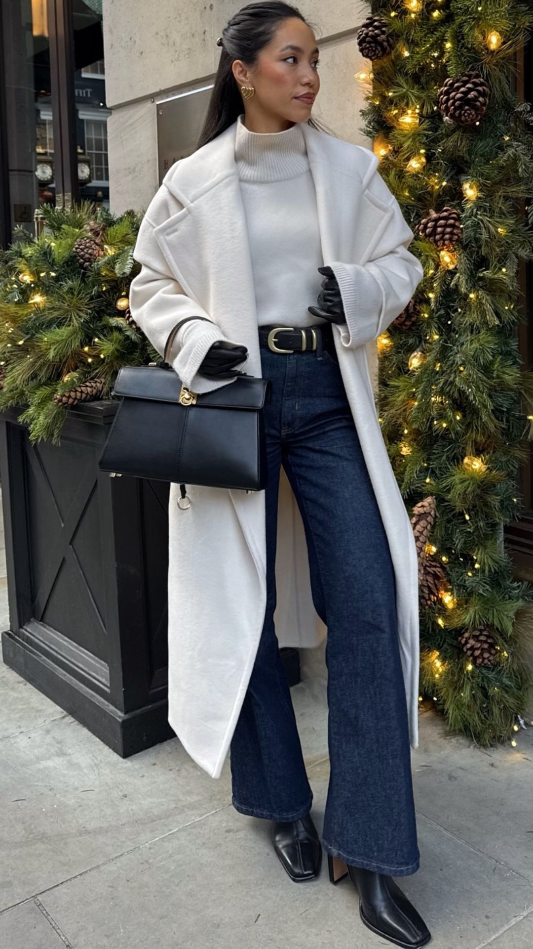 Underneath, a fitted high-neck white sweater provides warmth and elegance, while dark blue flared jeans add a trendy touch.