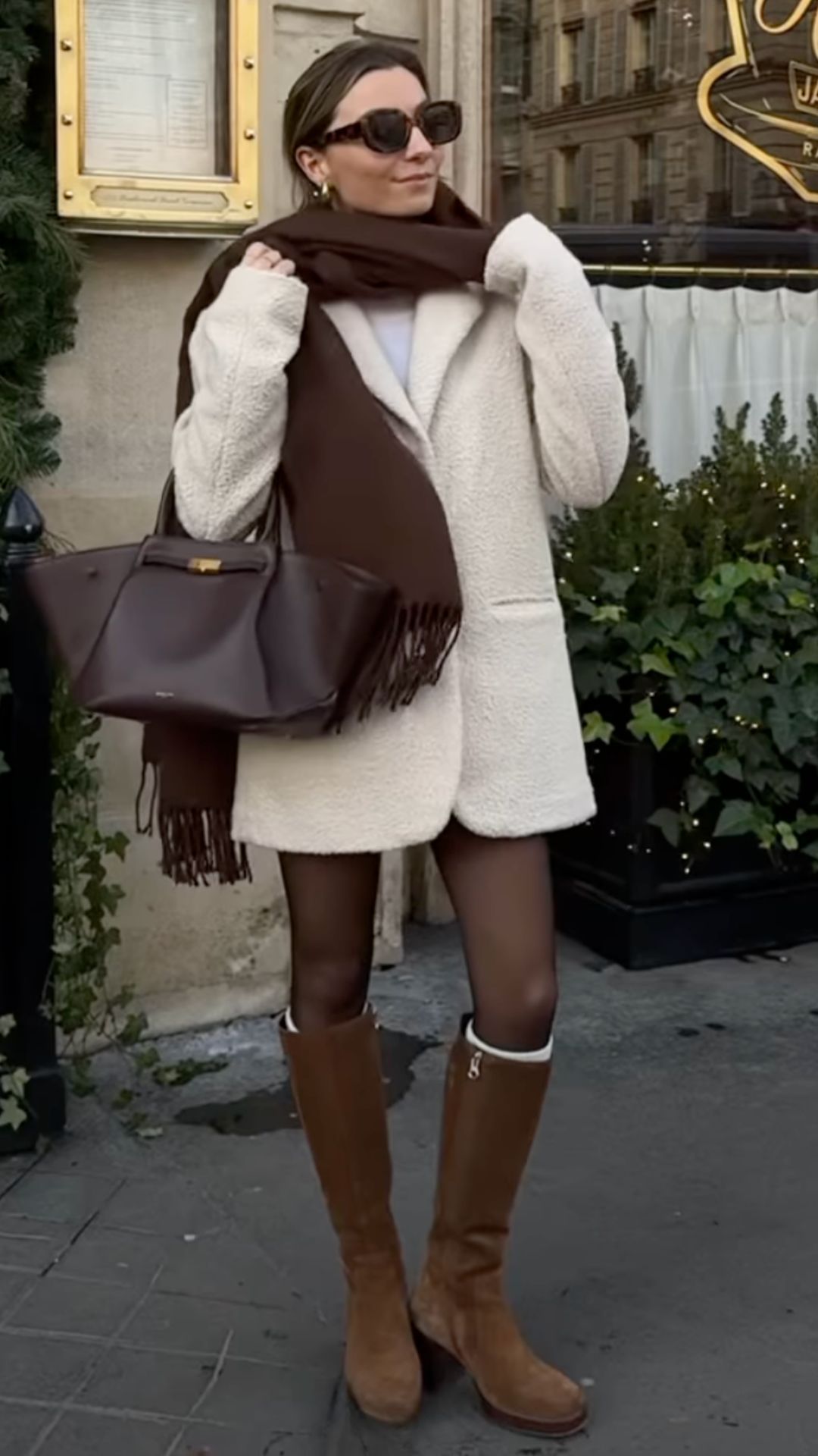 This chic winter outfit exemplifies European fashion with its luxurious textures and elegant layering.