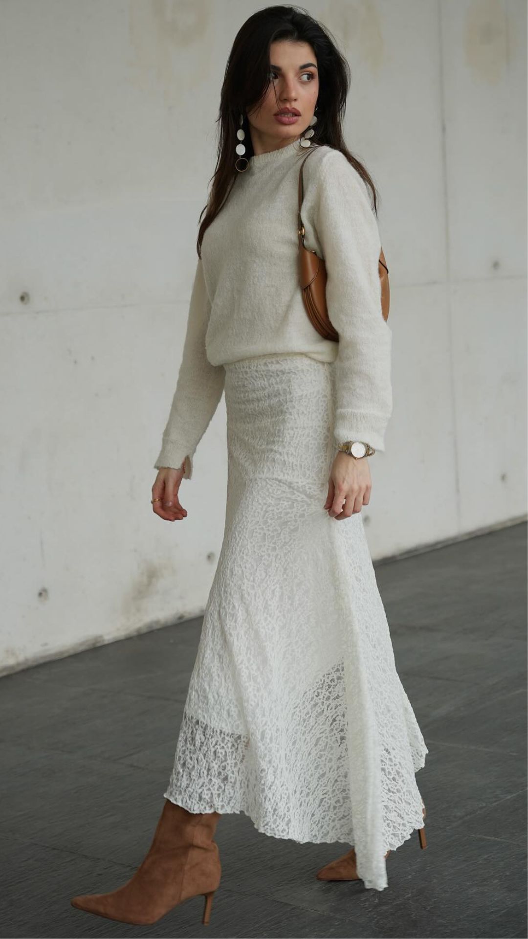 This European-inspired winter outfit exudes effortless elegance and charm. The cozy cream-colored sweater, crafted from a soft, textured knit, adds warmth and sophistication.