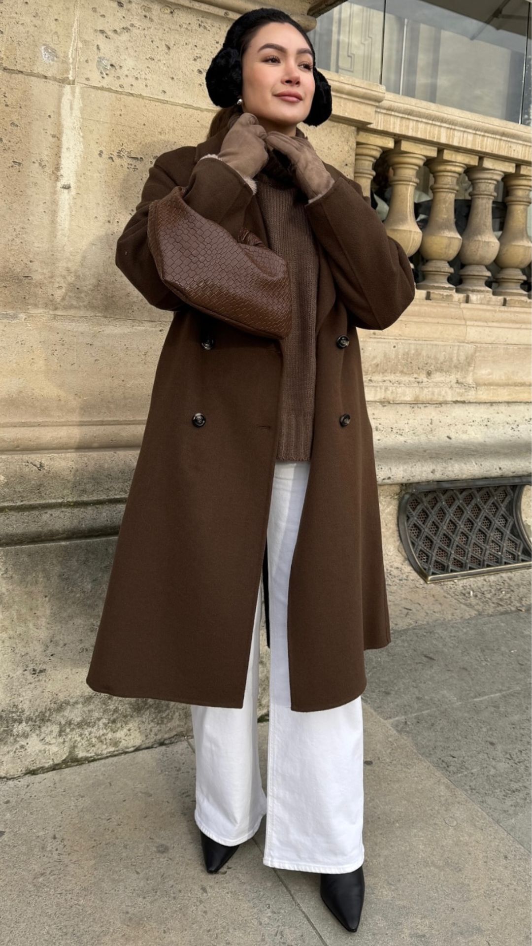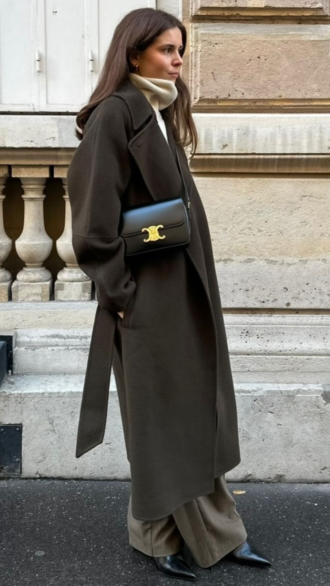 This beautiful outfit features a long, double-breasted wool coat in dark brown, known for its elegant silhouette, is a timeless piece that commands attention.