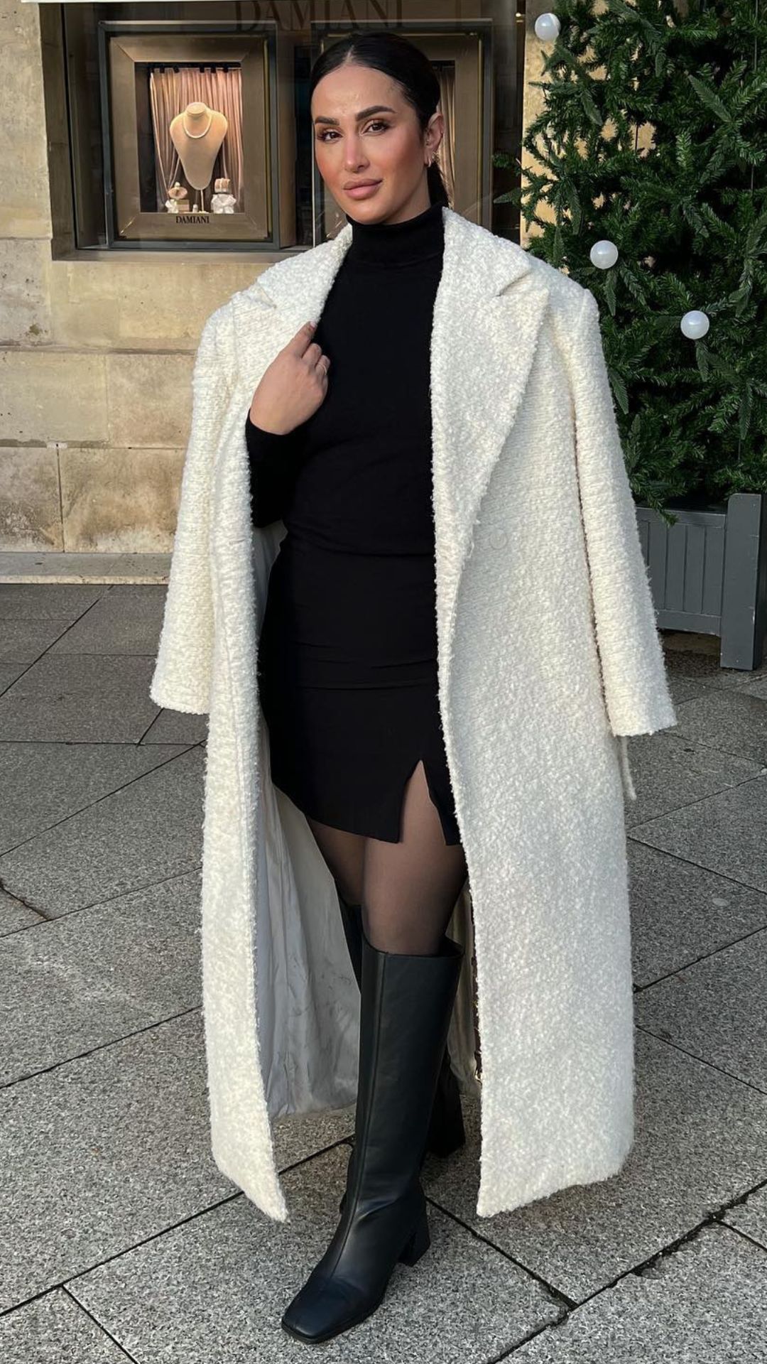 This winter outfit exemplifies the essence of European-inspired fashion for women. The textured, knee-length white coat made of fluffy fabric adds a luxurious touch, ensuring warmth without sacrificing style.
