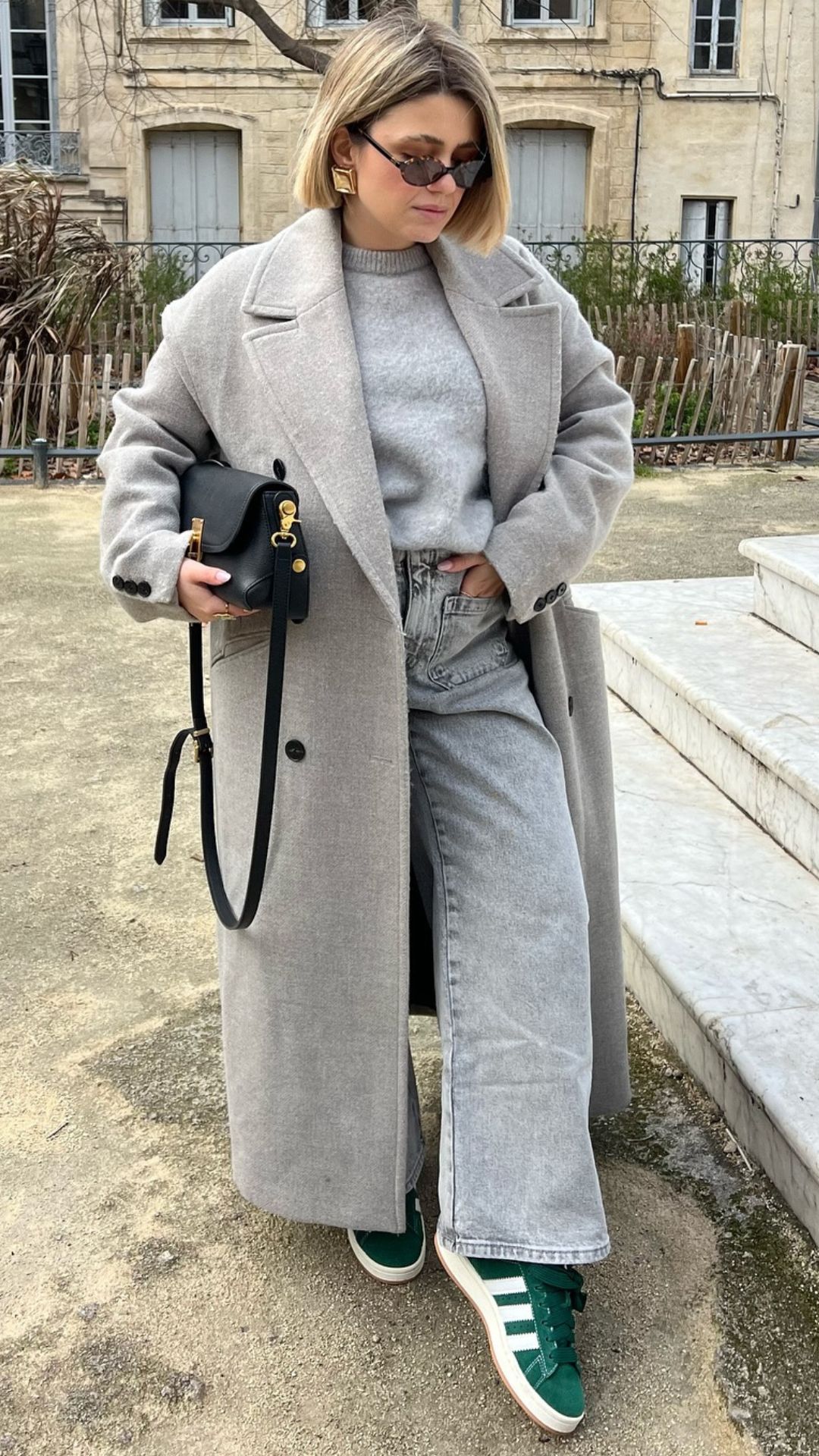 This chic ensemble showcases the effortless elegance of European winter fashion. The oversized light gray wool blend coat exudes sophistication, draping gracefully to the mid-calf, creating a relaxed yet stylish silhouette.
