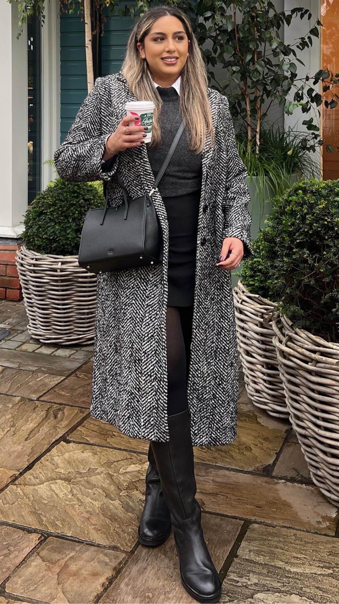 The long black-and-white herringbone patterned coat is a standout piece, offering texture and a structured silhouette that flatters the wearer.