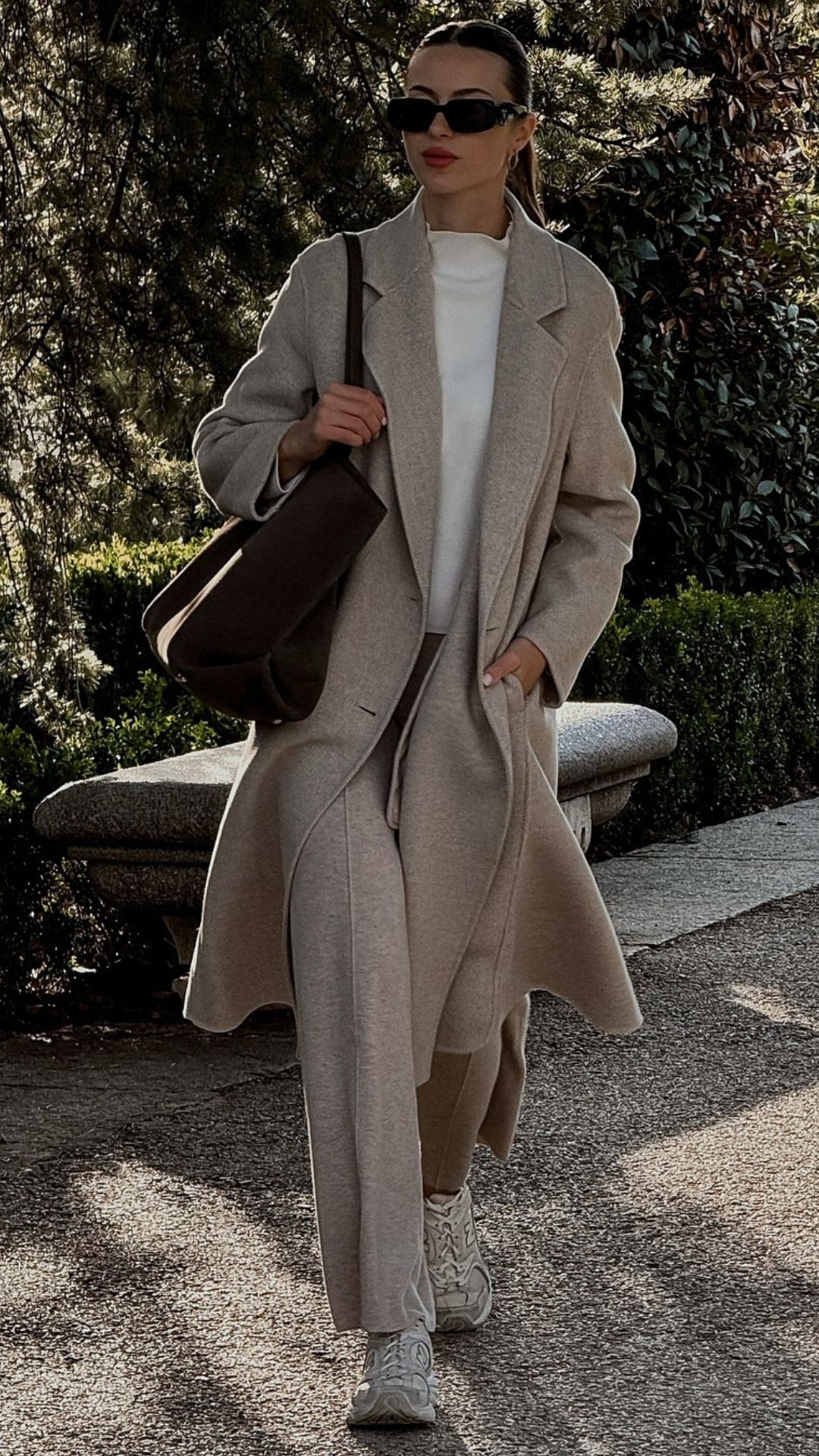 This chic winter outfit embodies the elegance of European fashion. The long light beige wool coat features a structured silhouette, offering warmth and style for colder days.