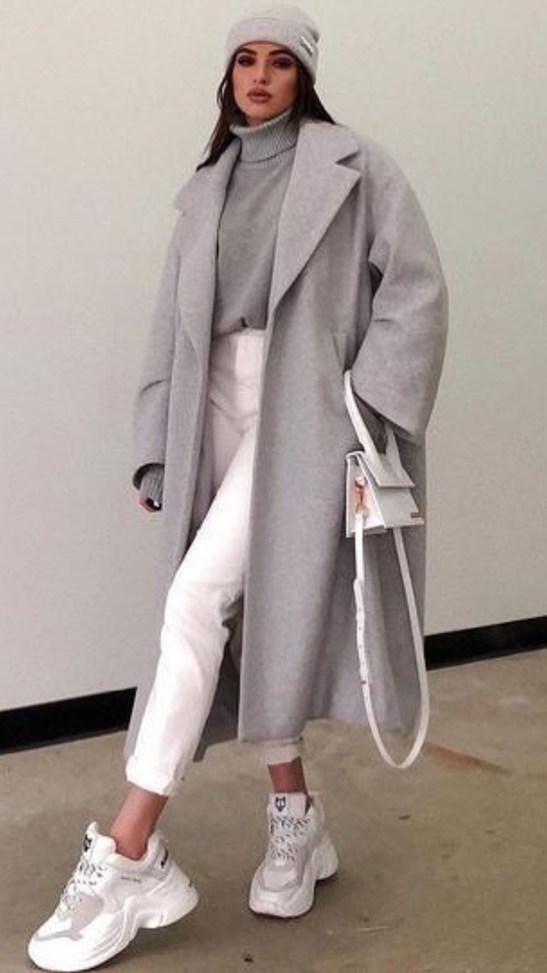 Layered over a matching turtleneck sweater, it provides both warmth and style. The slim-fit white trousers and chunky white sneakers offer a contemporary twist, ensuring comfort without sacrificing chicness.