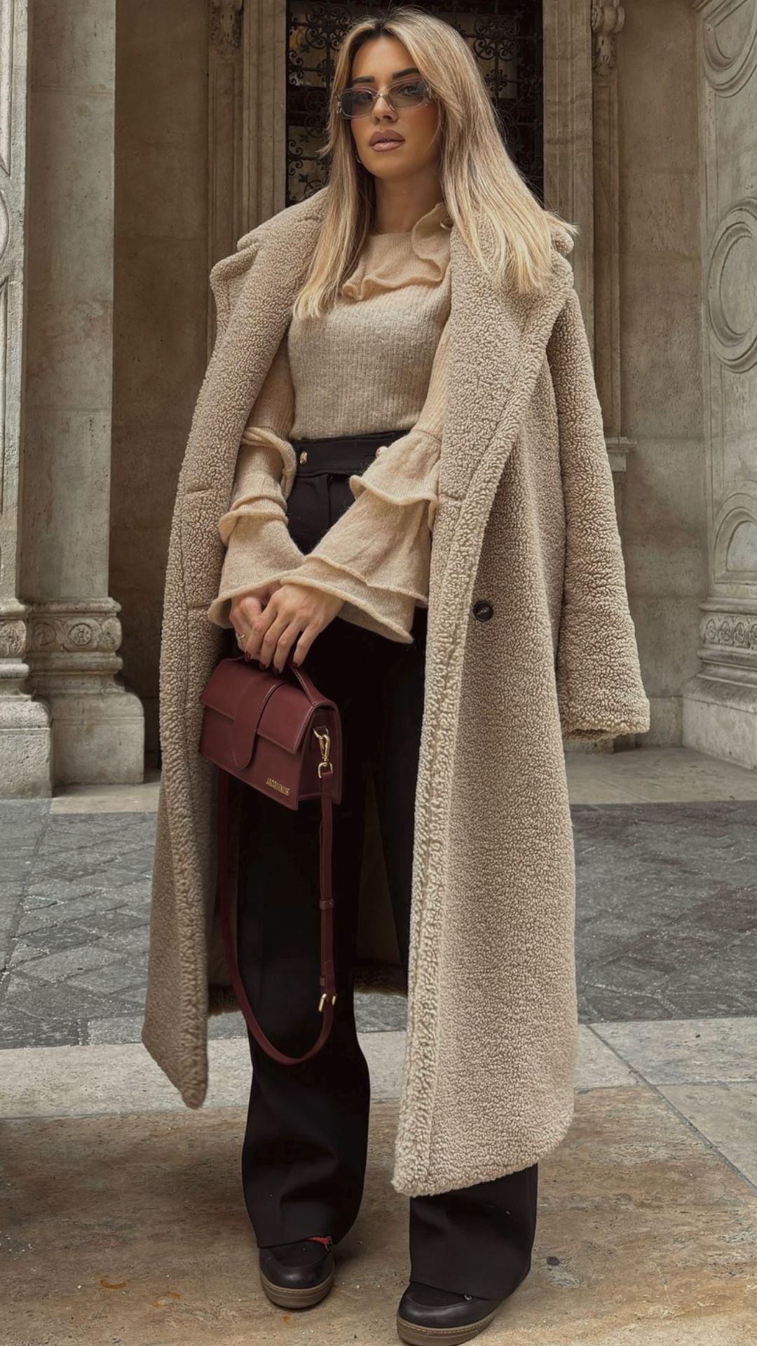 The long, plush teddy coat in beige provides both warmth and a trendy texture, setting the tone for the ensemble.