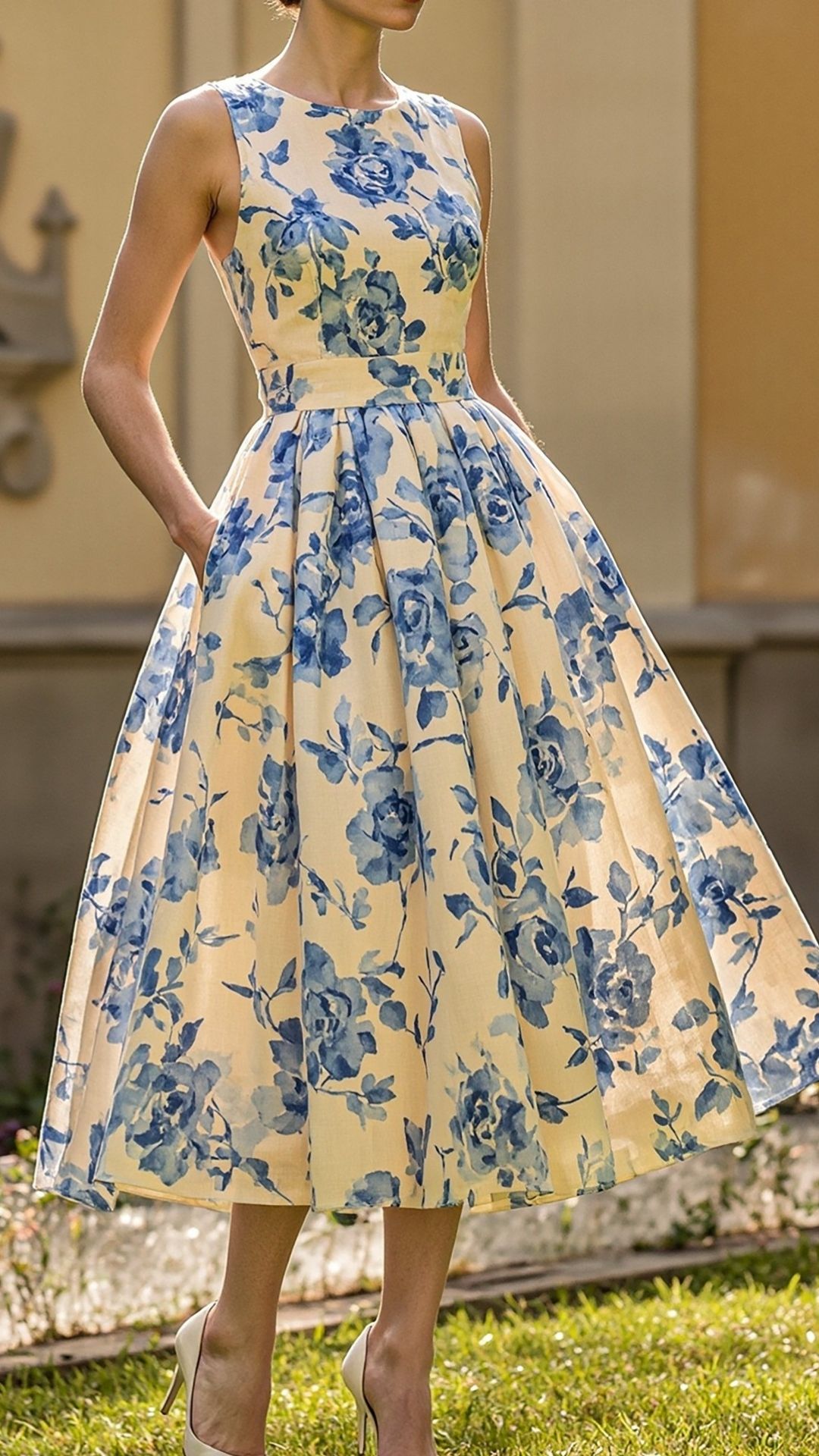 This exquisite floral dress embodies effortless elegance, perfect for upscale occasions such as weddings or garden parties.