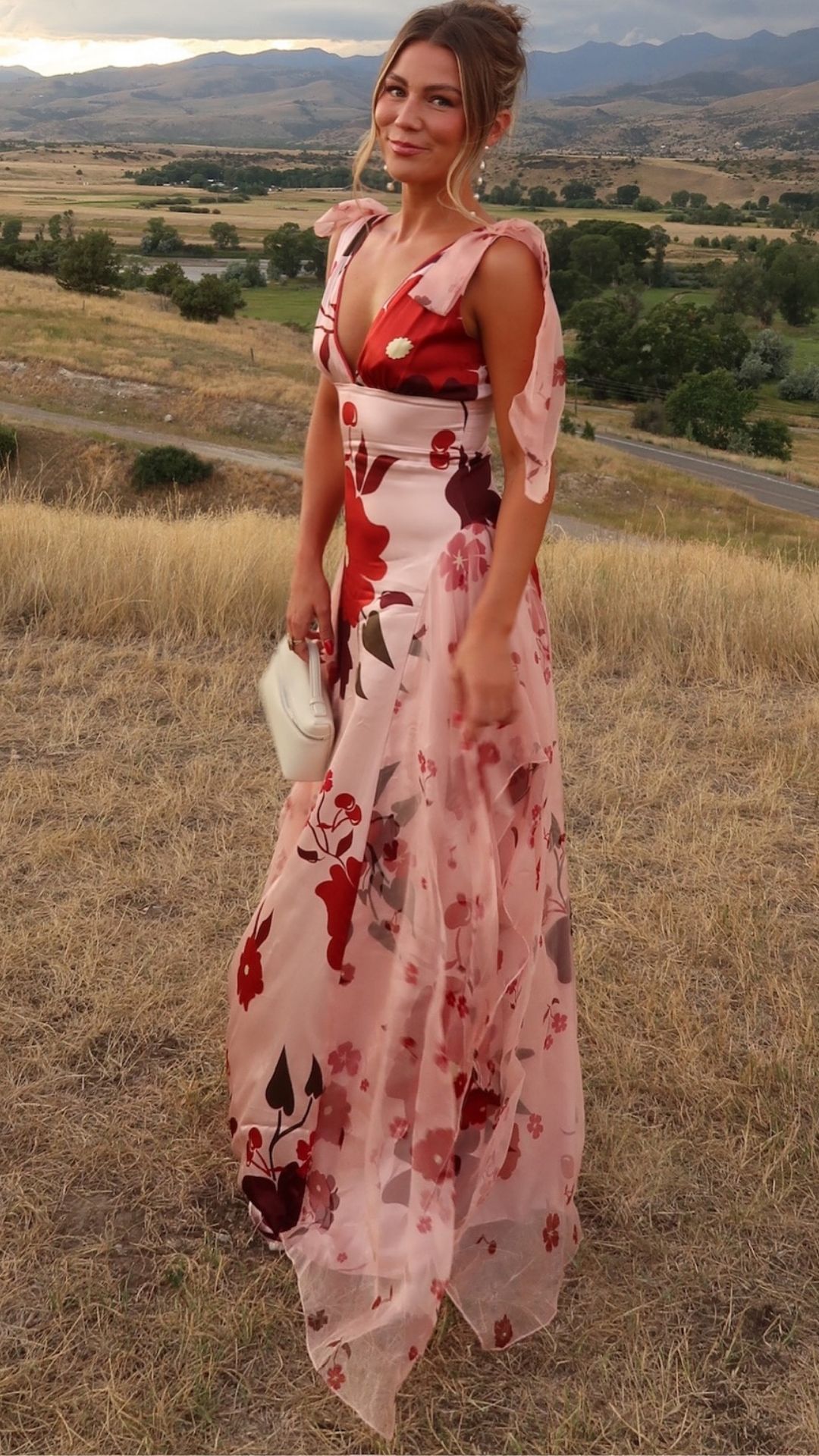 This stunning floral dress is designed to turn heads at any upscale event. The vibrant watercolor-style floral patterns in shades of red, pink, and green create a captivating visual.