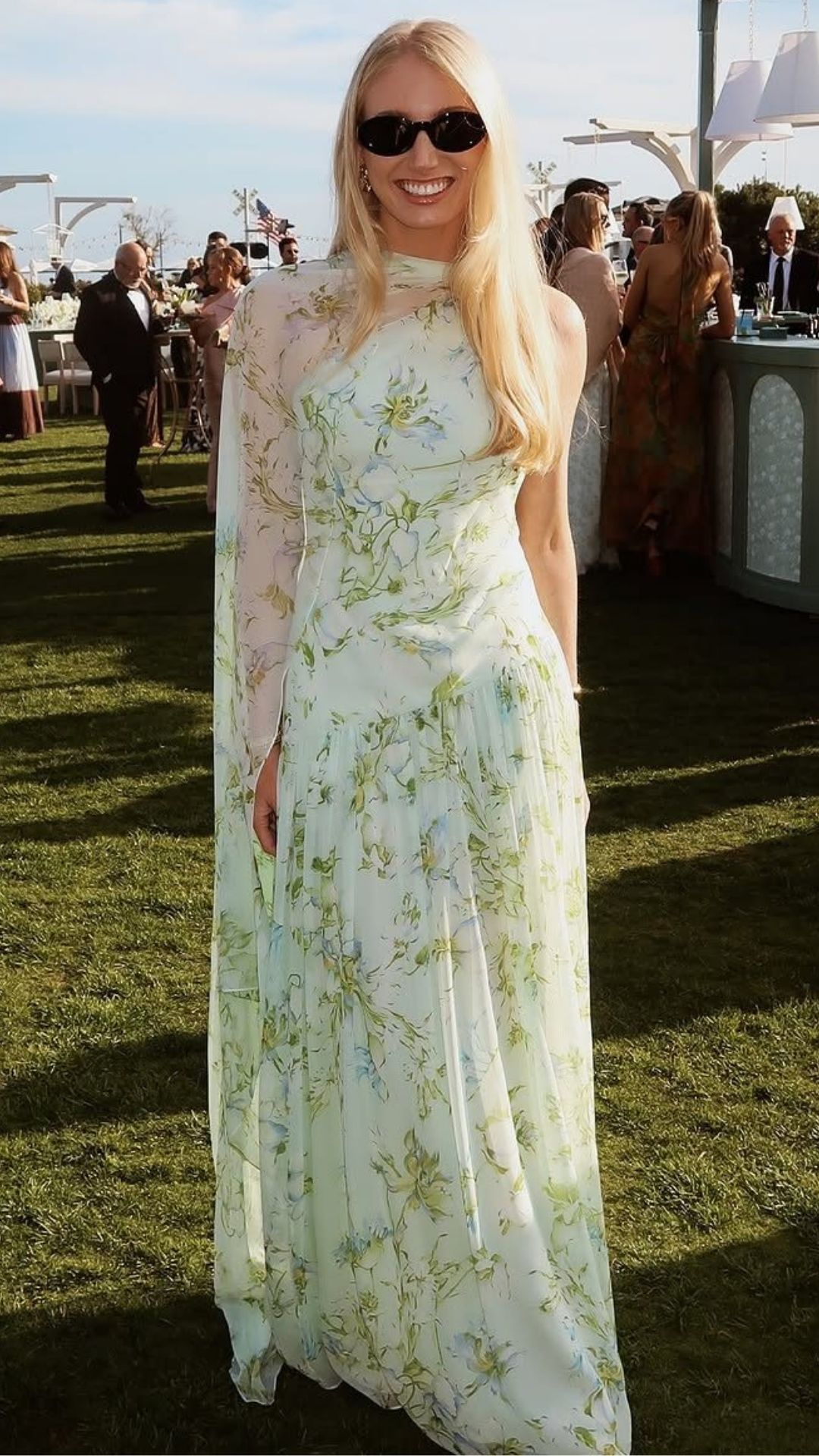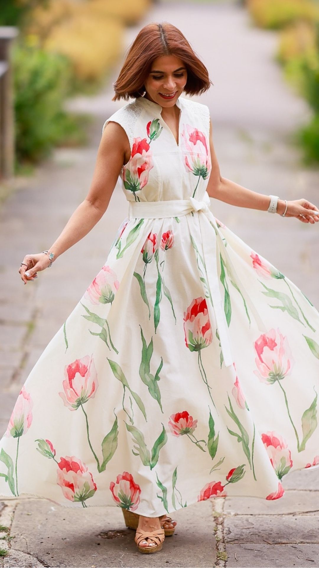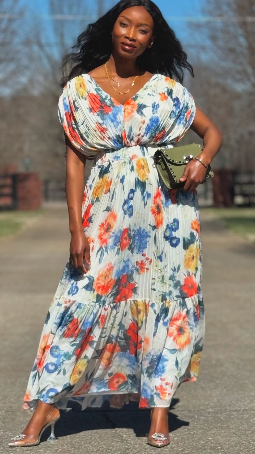 This stunning floral dress is a timeless piece, perfect for upscale events like weddings and garden parties.