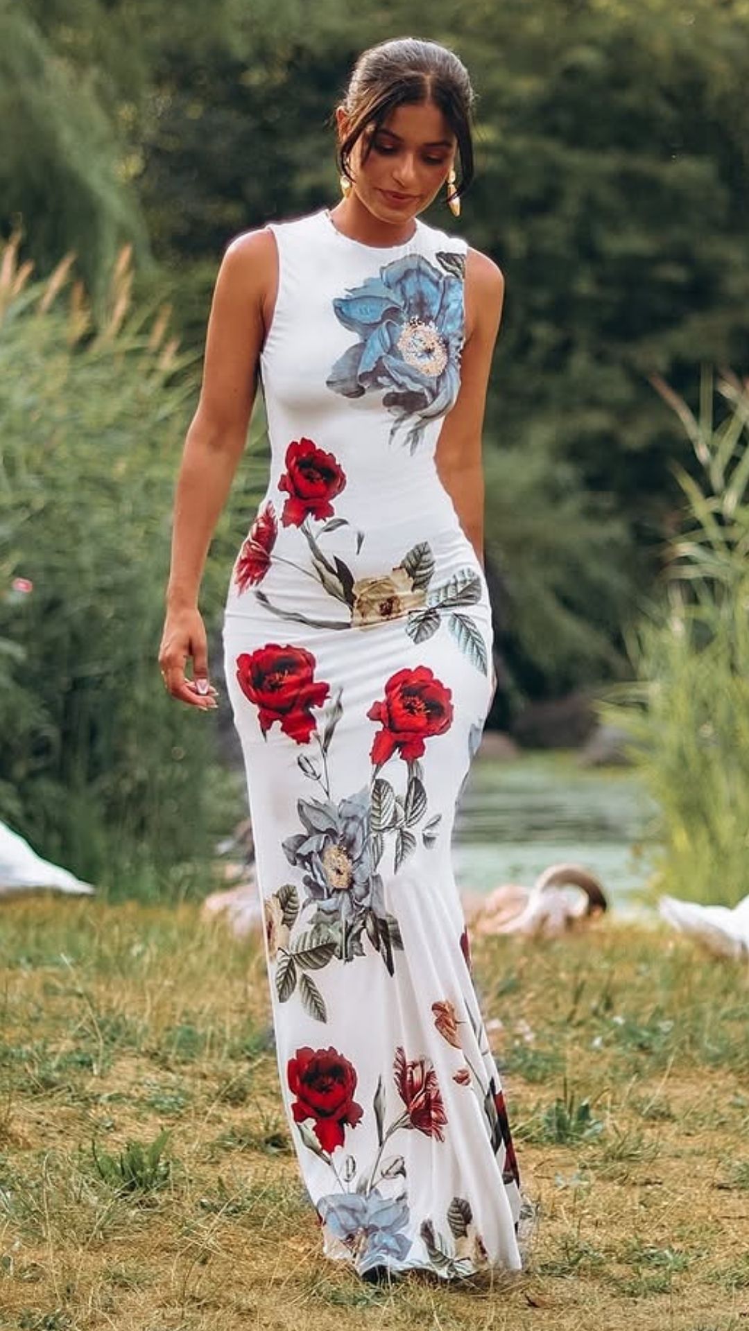 This figure-hugging maxi dress showcases a gorgeous white background, adorned with bold red roses and elegant blue peonies.