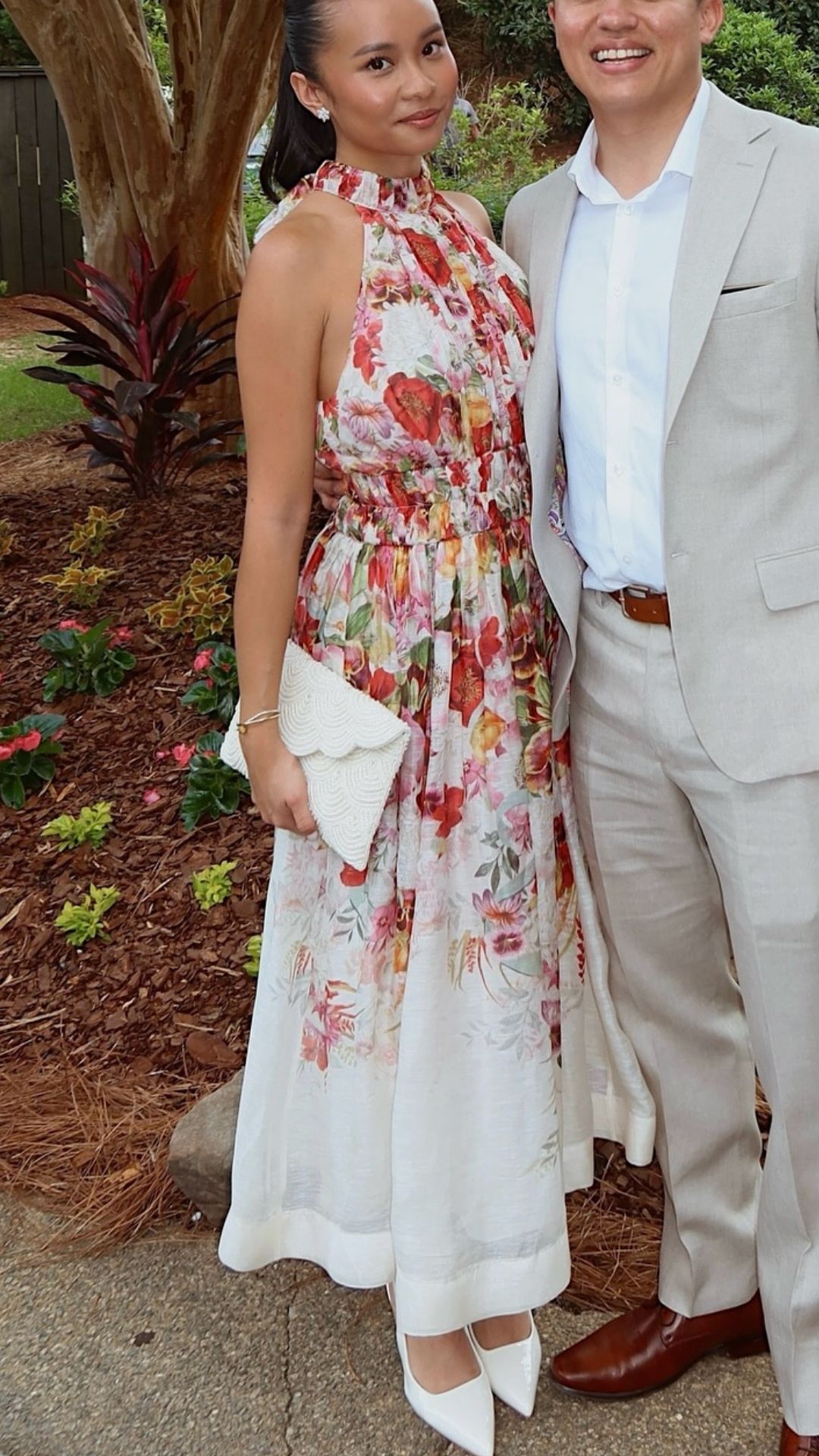 Paired with simple white heels and a coordinating handbag, it effortlessly combines beauty and sophistication, making it ideal for any stylish guest looking to impress.