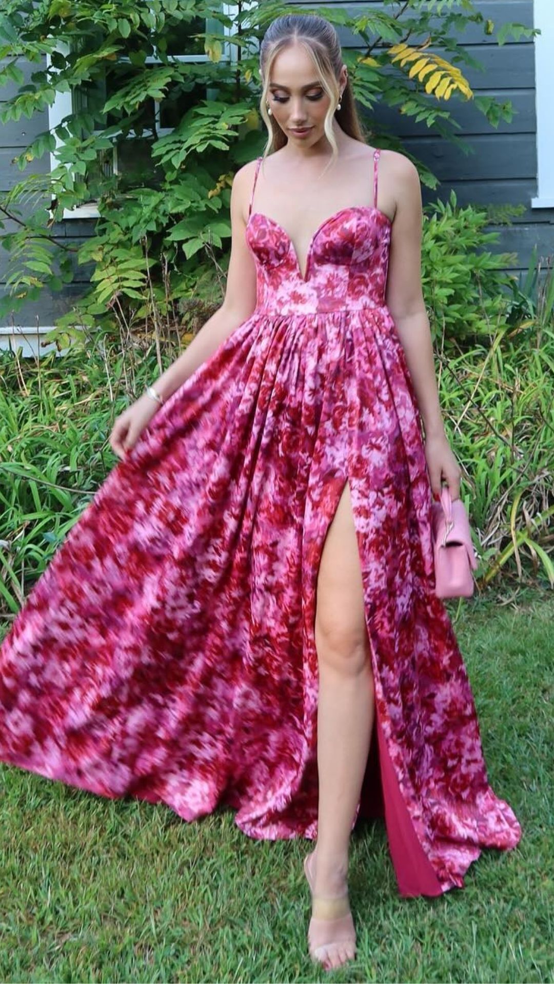 This stunning floor-length gown features a vibrant pink floral pattern that marries bold and soft blooms for a unique, romantic aesthetic.