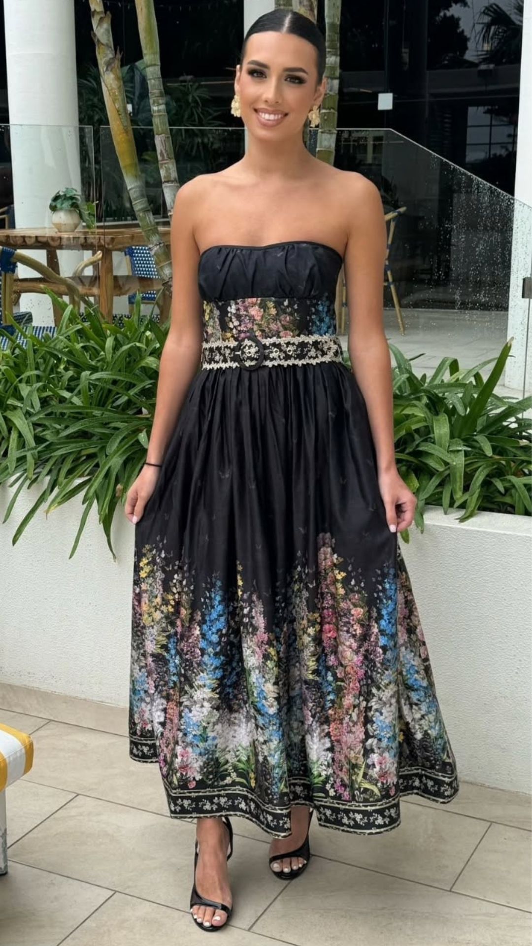This stunning floral dress stands out in the realm of elegant attire, effortlessly combining whimsy with sophistication.