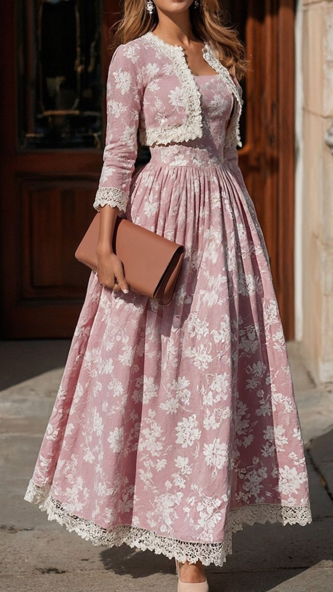 This exquisite floral dress features delicate pink patterns and a fitted bodice that transitions seamlessly into a flowing skirt.