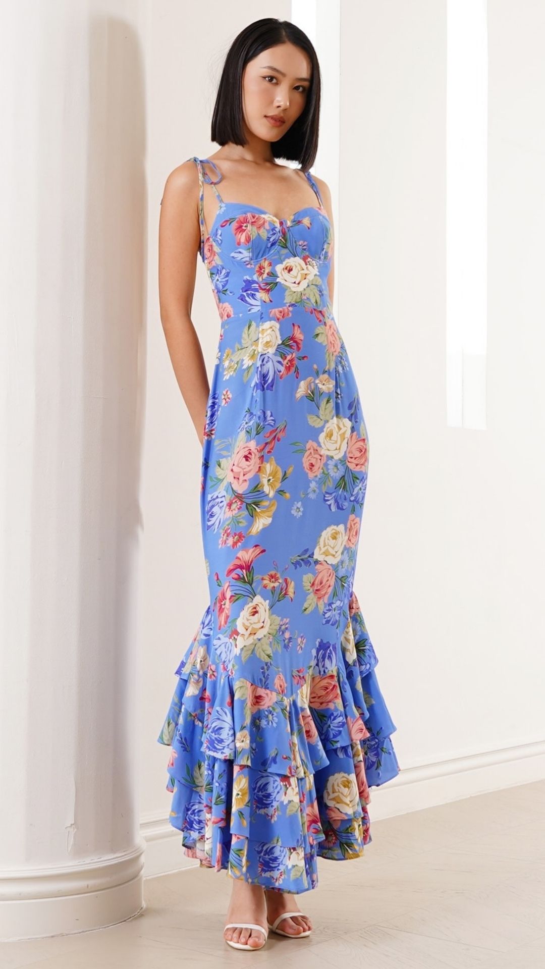 This long, tiered gown showcases a stunning vibrant blue floral pattern, presenting delicate blooms and flowing vines that evoke romance.